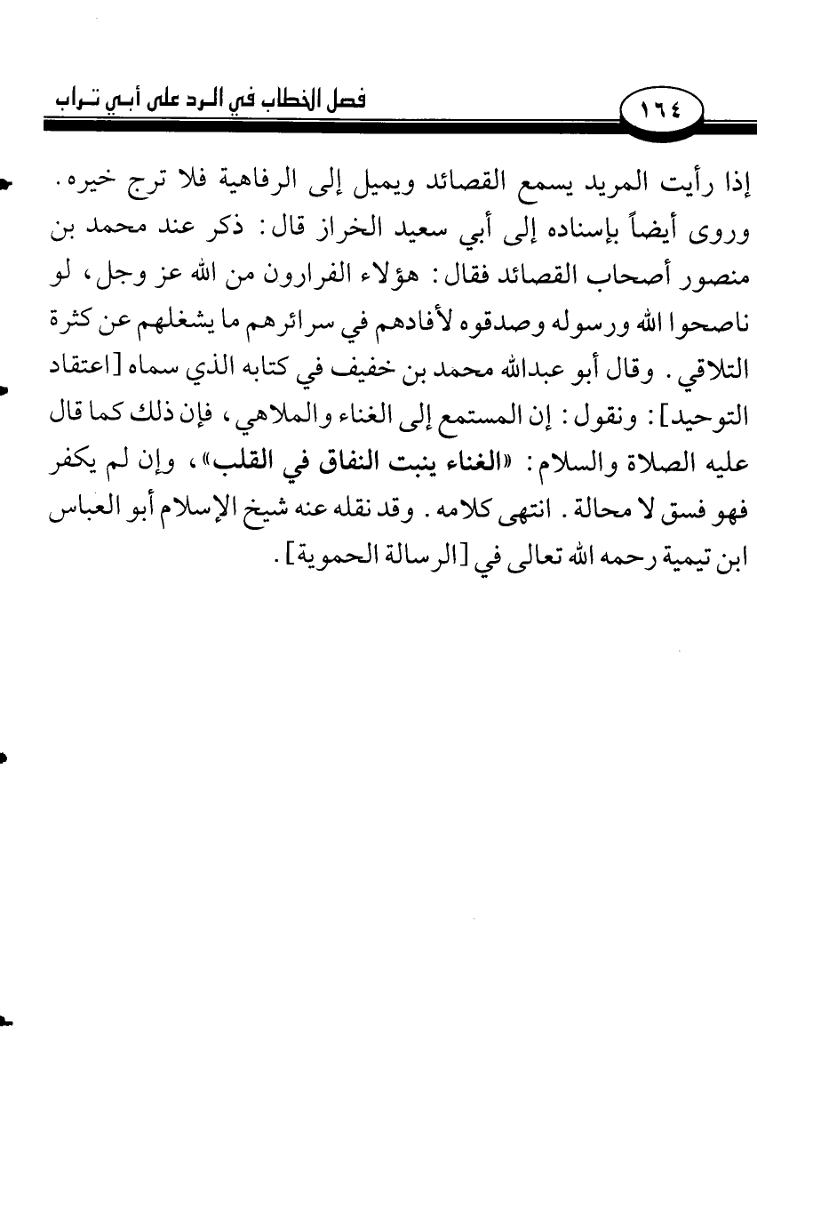 إذا رأيت المريد يسمع القصائد ويميل إلى الرفاهية فلا ترج خيره. وروى أيضاً بإسناده إلى أبي سعيد الخراز قال: ذكر عند محمد بن منصور أصحاب القصائد فقال: هؤلاء الفرارون من الله عز وجل، لو ناصحوا الله ورسوله وصدقوه لأفادهم في سرائرهم ما يشغلهم عن كثرة التلاقي. وقال أبو عبد الله محمد بن خفيف في كتابه الذي سماه [اعتقاد التوحيد]: ونقول: إن المستمع إلى الغناء والملاهي، فإن ذلك كما قال عليه الصلاة والسلام: «الغناء ينبت النفاق في القلب»، وإن لم يكفر فهو فسق لا محالة. انتهى كلامه. وقد نقله عنه شيخ الإسلام أبو العباس ابن تيمية رحمه الله تعالى في [الرسالة الحموية].