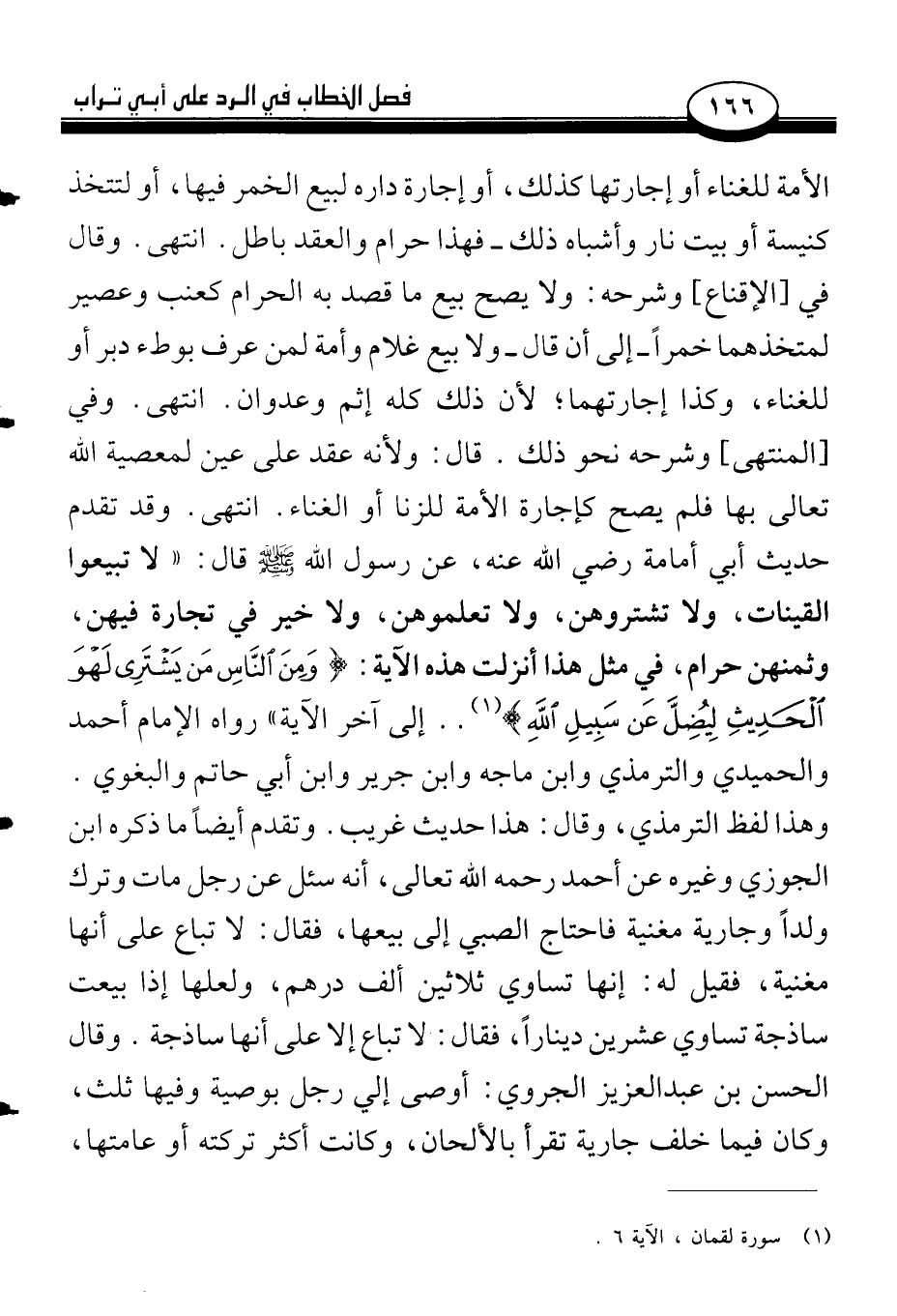 الأمة للغناء أو إجارتها كذلك، أو إجارة داره لبيع الخمر فيها، أو لتتخذ كنيسة أو بيت نار أو أشباه ذلك - فهذا حرام والعقد باطل. انتهى. وقال في [الإقناع] وشرحه: ولا يصح بيع ما قصد به الحرام كعنب وعصير لمتخذهما خمراً - إلى أن قال - ولا بيع غلام ولا أمة لمن عرف بوطء دبر أو للغناء، وكذا إجارتهما؛ لأن ذلك كله إثم وعدوان. انتهى. وفي [المنتهى] وشرحه نحو ذلك. قال: ولأنه عقد على عين لمعصية الله تعالى بها فلم يصح كإجارة الأمة للزنا أو الغناء. انتهى. وقد تقدم أبي أمامة رضي الله عنه، عن رسول الله صلى الله عليه وسلم قال: «لا تبيعوا القينات، ولا تشتروهن، ولا تعلموهن، ولا خير في تجارة فيهن، وثمنهن حرام، وفي مثل هذا أنزلت هذه الآية: {وَمِنَ النَّاسِ مَن يَشْتَرِي لَهْوَ الْحَدِيثِ لِيُضِلَّ عَن سَبِيلِ اللَّهِ} (¬1). . . إلى آخر الآية» رواه الإمام أحمد والحميدي والترمذي وابن ماجه وابن جرير وابن أبي حاتم والبغوي. وهذا لفظ الترمذي، وقال: هذا حديث غريب. وتقدم أيضاً ما ذكره ابن الجوزي وغيره عن أحمد رحمه الله تعالى، أنه سئل عن رجل مات وترك ولداً وجارية مغنية فاحتاج الصبي إلى بيعها، فقال: لا تباع على أنها مغنية، فقيل له: إنها تساوي ثلاثين ألف درهم، ولعلها إذا بيعت ساذجة تساوي عشرين ديناراً، فقال: لا تباع إلا على أنها ساذجة. وقال الحسن بن عبد العزيز الجروي: أوصى إلى رجل بوصية وفيها ثلث، وكان فيما خلف جارية تقرأ بالألحان، وكانت أكثر تركته أو عامتها،