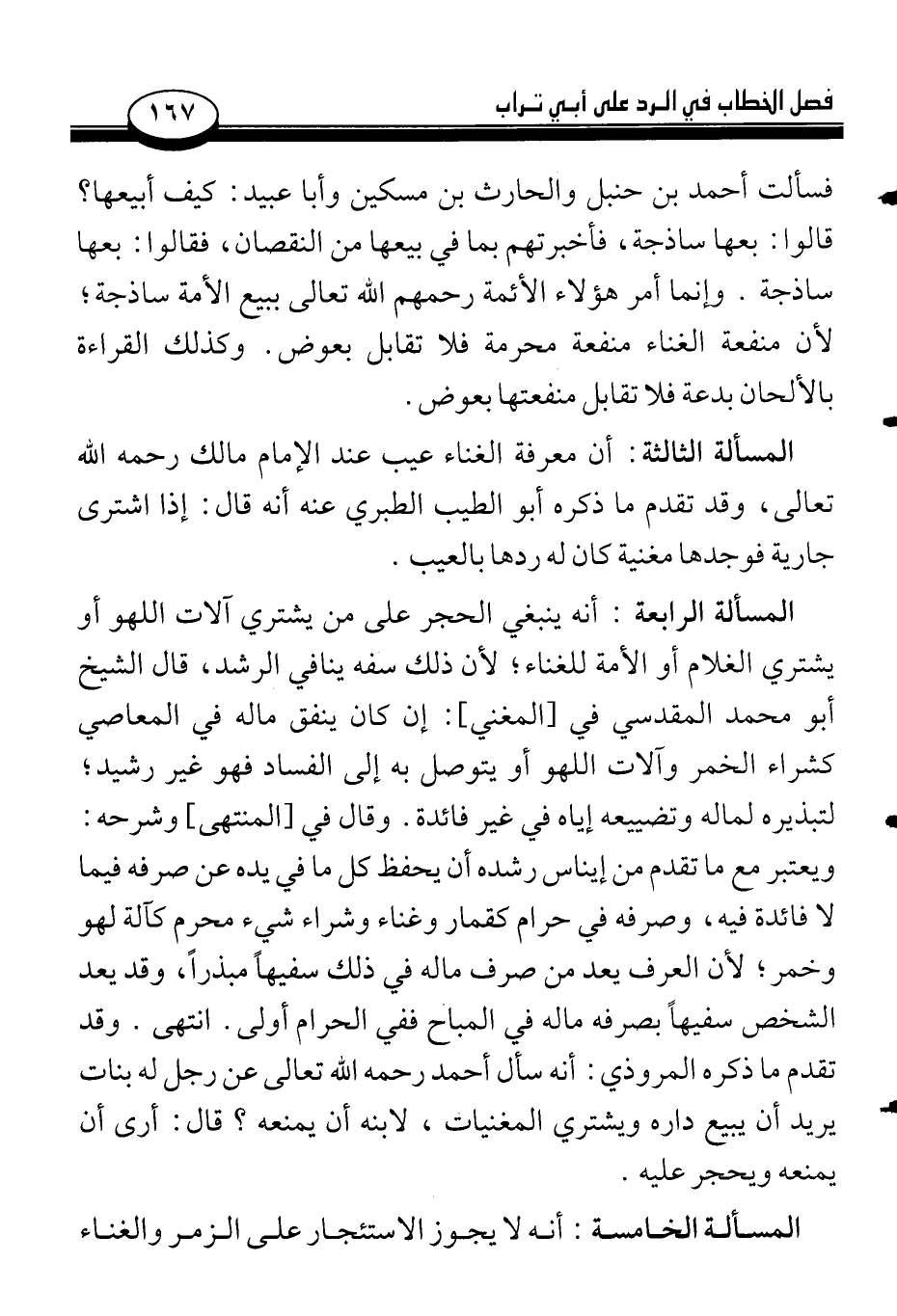 المسألة الرابعة: أنه ينبغي الحجر على من يشتري آلات اللهو أو يشتري الغلام أو الأمة للغناء؛ لأن ذلك سفه ينافي الرشد، قال الشيخ أبو محمد المقدسي في [المغني]: إن كان ينفق ماله في المعاصي كشراء الخمر وآلات اللهو أو يتوصل به إلى الفساد فهو غير رشيد؛ لتبذيره لماله وتضييعه إياه في غير فائدة. وقال في [المنتهى] وشرحه: ويعتبر مع ما تقدم من إيناس رشده أن يحفظ كل ما في يده عن صرفه فيما لا فائدة فيه، وصرفه في حرام كقمار وغناء وشراء شيء محرم كآلة لهو وخمر؛ لأن العرف يعد من صرف ماله في ذلك سفيهاً مبذراً، وقد يعد الشخص سفيهاً بصرفه ماله في المباح ففي الحرام أولى. انتهى. وقد تقدم ما ذكره المروذي: أنه سأل أحمد رحمه الله تعالى عن رجل له بنات يريد أن يبيع داره ويشتري المغنيات، لابنه أن يمنعه؟ قال: أرى أن يمنعه ويحجر عليه.