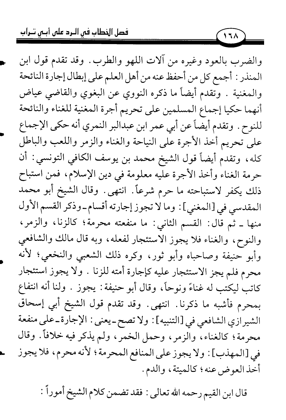 والضرب بالعود وغيره من آلات اللهو والطرب. وقد تقدم قول ابن المنذر: أجمع كل من أحفظ عنه من أهل العلم على إبطال إجارة النائحة والمغنية. وتقدم أيضاً ما ذكره النووي عن البغوي والقاضي عياض أنهما حكيا إجماع المسلمين على تحريم أجرة المغنية للغناء والنائحة للنوح. وتقدم أيضاً عن أبي عمر ابن عبد البر النمري أنه حكى الإجماع على تحريم أخذ الأجرة على النياحة والغناء والزمر واللعب والباطل كله، وتقدم أيضاً قول الشيخ محمد بن يوسف الكافي التونسي: أن حرمة الغناء وأخذ الأجرة عليه معلومة في دين الإسلام، فمن استباح ذلك يكفر لاستباحته ما حرم شرعاً. انتهى. وقال الشيخ أبو محمد المقدسي في [المغني]: وما لا تجوز إجازته أقسام - وذكر القسم الأول منها - ثم قال: القسم الثاني: ما منفعته محرمة؛ كالزنا، والزمر، والنوح، والغناء فلا يجوز الاستئجار لفعله، وبه قال مالك والشافعي وأبو حنيفة وصاحباه وأبو ثور، وكره ذلك الشعبي والنخعي؛ لأنه محرم فلم يجز الاستئجار عليه كإجارة أمته للزنا. ولا يجوز استئجار كاتب ليكتب له غناءً ونوحاً، وقال أبو حنيفة: يجوز. ولنا أنه انتفاع بمحرم فأشبه ما ذكرنا. انتهى. وقد تقدم قول الشيخ أبي إسحاق الشيرازي الشافعي في [التنبيه]: ولا تصح - يعني: الإجارة - على منفعة محرمة؛ كالغناء، والزمر، وحمل الخمر، ولم يذكر فيه خلافاً. وقال في [المذهب]: ولا يجوز على المنافع المحرمة؛ لأنه محرم، فلا يجوز أخذ العوض عنه؛ كالميتة، والدم.