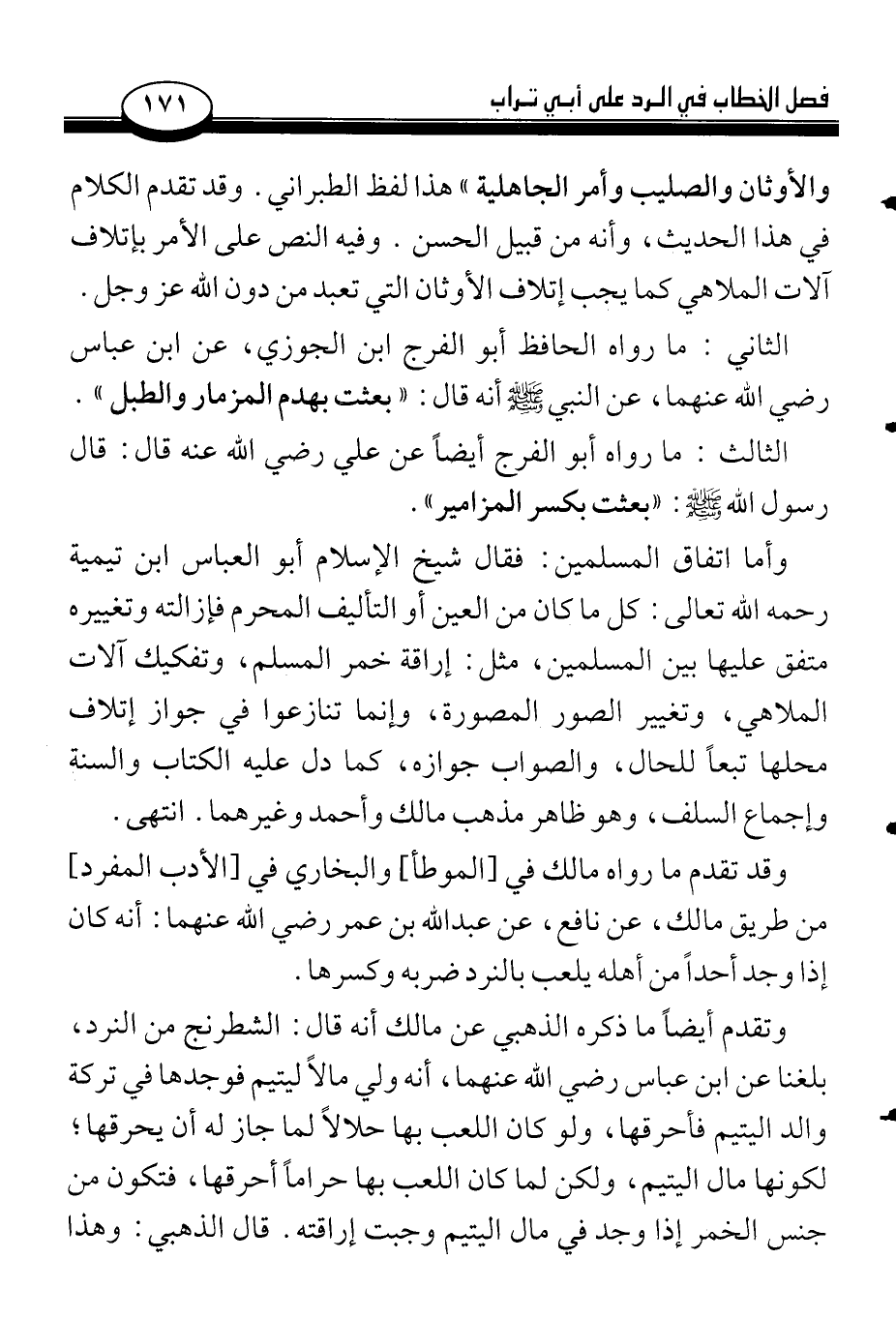 الثاني: ما رواه الحافظ أبو الفرج ابن الجوزي، عن ابن عباس رضي الله عنهما، عن النبي صلى الله عليه وسلم أنه قال: «بعثت بهدم المزمار والطبل».