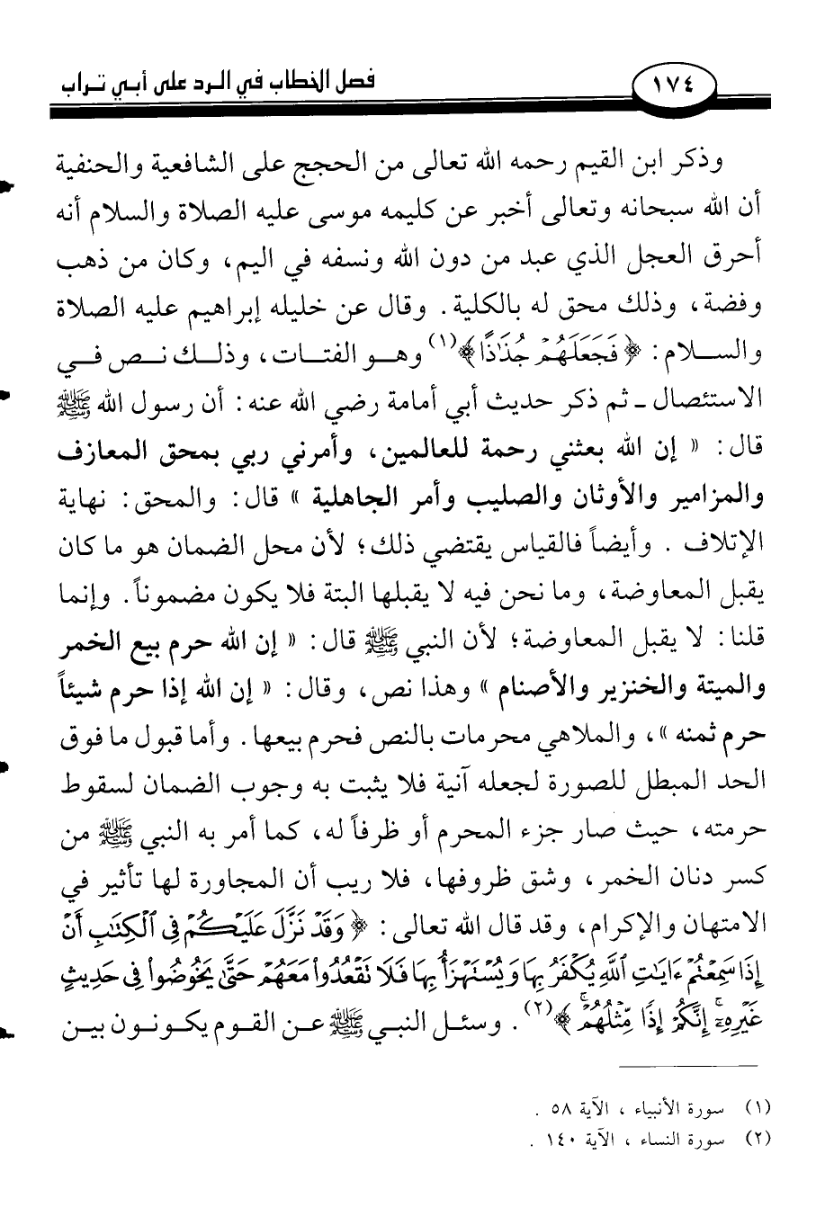وذكر ابن القيم رحمه الله تعالى من الحجج على الشافعية والحنفية أن الله سبحانه وتعالى أخبر عن كليمه موسى عليه الصلاة والسلام أنه أحرق العجل الذي عبد من دون الله ونسفه في اليم، وكان من ذهب وفضة، وذلك محق له بالكلية. وقال عن خليله إبراهيم عليه الصلاة والسلام: {فَجَعَلَهُمْ جُذَاذاً} (¬1) وهو الفتات، وذلك نص في الاستئصال - ثم ذكر حديث أبي أمامة رضي الله عنه: أن رسول الله صلى الله عليه وسلم قال: «إن الله بعثني رحمة للعالمين، وأمرني ربي بمحق المعازف والمزامير والأوثان والصليب وأمر الجاهلية» قال: والمحق: نهاية الإتلاف. وأيضاً فالقياس يقتضي ذلك؛ لأن محل الضمان هو ما كان يقبل المعاوضة، وما نحن فيه لا يقبلها البتة فلا يكون مضموناً. وإنما قلنا: لا يقبل المعاوضة؛ لأن النبي صلى الله عليه وسلم: «إن الله حرم بيع الخمر والميتة والخنزير والأصنام» وهذا نص، وقال: «إن الله إذا حرم شيئاً حرم ثمنه»، والملاهي محرمات بالنص فحرم بيعها. وأما قبول ما فوق الحد المبطل للصورة لجعله آنية فلا يثبت به وجوب الضمان لسقوط حرمته، حيث صار جزء المحرم أو ظرفاً له، كما أمر به النبي صلى الله عليه وسلم من كسر دنان الخمر، وشق ظروفها، فلا ريب أن المجاورة لها تأثير في الامتهان والإكرام، وقد قال الله تعالى: {وَقَدْ نَزَّلَ عَلَيْكُمْ فِي الْكِتَابِ أَنْ إِذَا سَمِعْتُمْ آيَاتِ اللّهِ يُكَفَرُ بِهَا وَيُسْتَهْزَأُ بِهَا فَلاَ تَقْعُدُوا مَعَهُمْ حَتَّى يَخُوضُوا فِي حَدِيثٍ غَيْرِهِ إِنَّكُمْ إِذاً مِّثْلُهُمْ} (¬2). وسئل النبي صلى الله عليه وسلم عن القوم يكونون بين