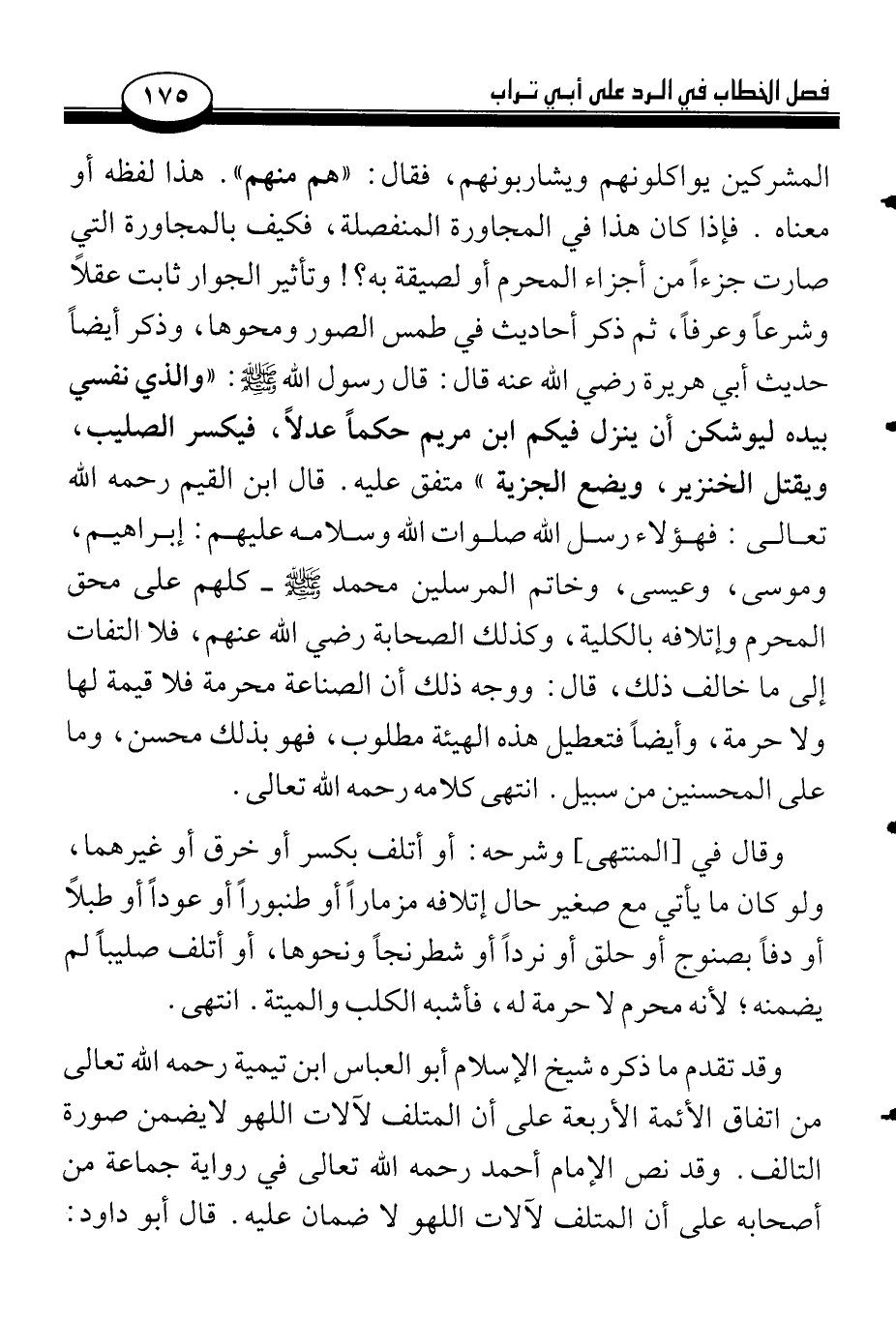 المشركين يواكلونهم ويشاربونهم، فقال: «هم منهم». هذا لفظه أو معناه. فإذا كان هذا في المجاورة المنفصلة، فكيف بالمجاورة التي صارت جزءاً من أجزاء المحرم أو لصيقة به؟! وتأثير الجوار ثابت عقلاً وشرعاً وعرفاً، ثم ذكر أحاديث في طمس الصور ومحوها، وذكر أيضاً حديث أبي هريرة رضي الله عنه قال: قال رسول الله صلى الله عليه وسلم: «والذي نفسي بيده ليوشكن أن ينزل فيكم ابن مريم حكماً عدلاً، فيكسر الصليب، ويقتل الخنزير، ويضع الجزية» متفق عليه. قال ابن القيم رحمه الله تعالى: فهؤلاء رسل الله صلوات الله وسلامه عليهم: إبراهيم، وموسى، وعيسى، وخاتم المرسلين محمد صلى الله عليه وسلم - كلهم على محق المحرم وإتلافه بالكلية، وكذلك الصحابة رضي الله عنهم، فلا التفات إلى ما خالف ذلك، قال: ووجه ذلك أن الصناعة محرمة فلا قيمة لها ولا حرمة، وأيضاً فتعطيل هذه الهيئة مطلوب، فهو بذلك محسن، وما على المحسنين من سبيل. انتهى كلامه رحمه الله تعالى.