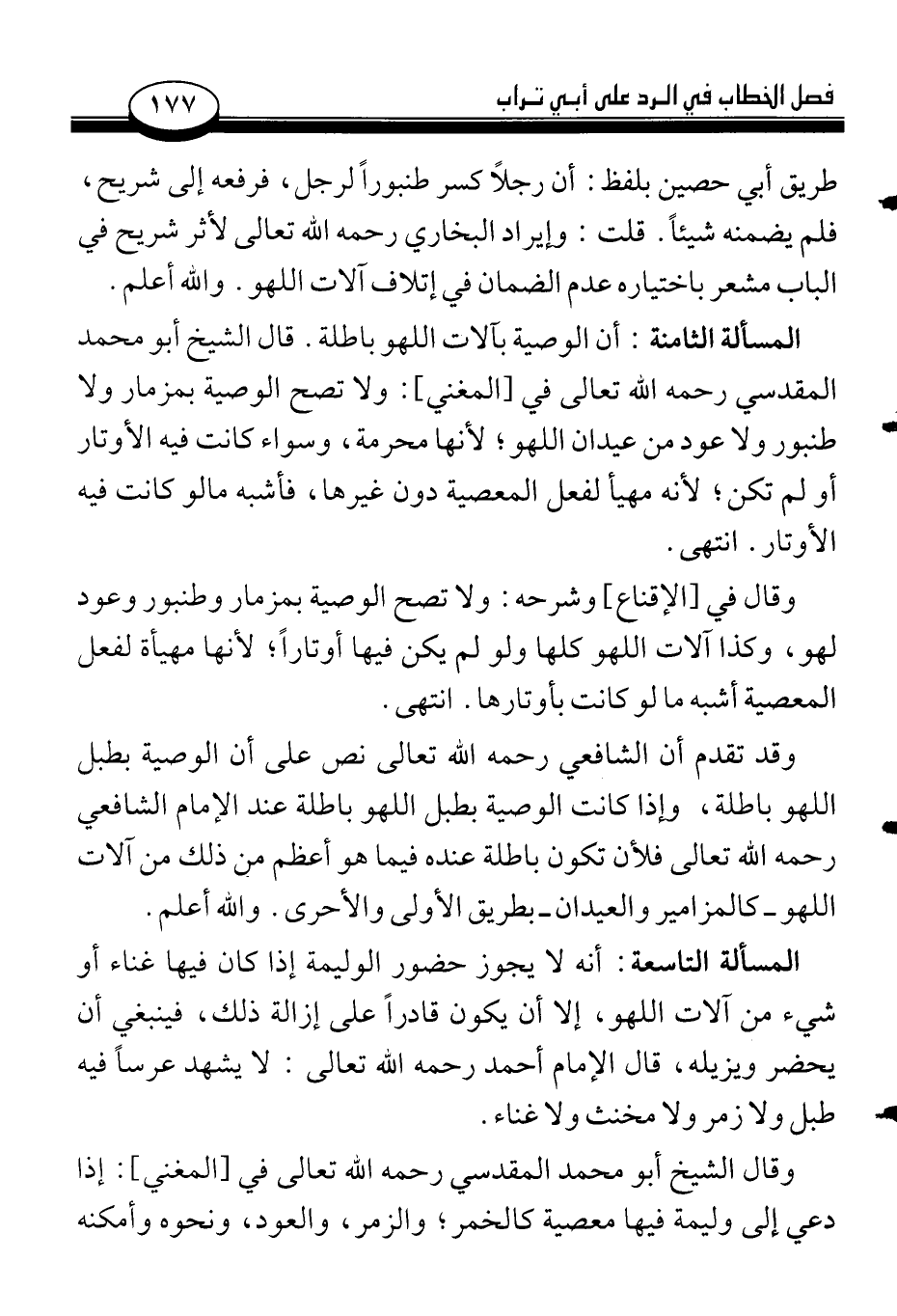 المسألة الثامنة: أن الوصية بآلات اللهو باطلة. قال الشيخ أبو محمد المقدسي رحمه الله تعالى في [المغني]: ولا تصح الوصية بمزمار ولا طنبور ولا عود من عيدان اللهو؛ لأنها محرمة، وسواء كانت فيه الأوتار أو لم تكن؛ لأنه مهيأ لفعل المعصية دون غيرها، فأشبه ما لو كانت فيه الأوتار. انتهى.