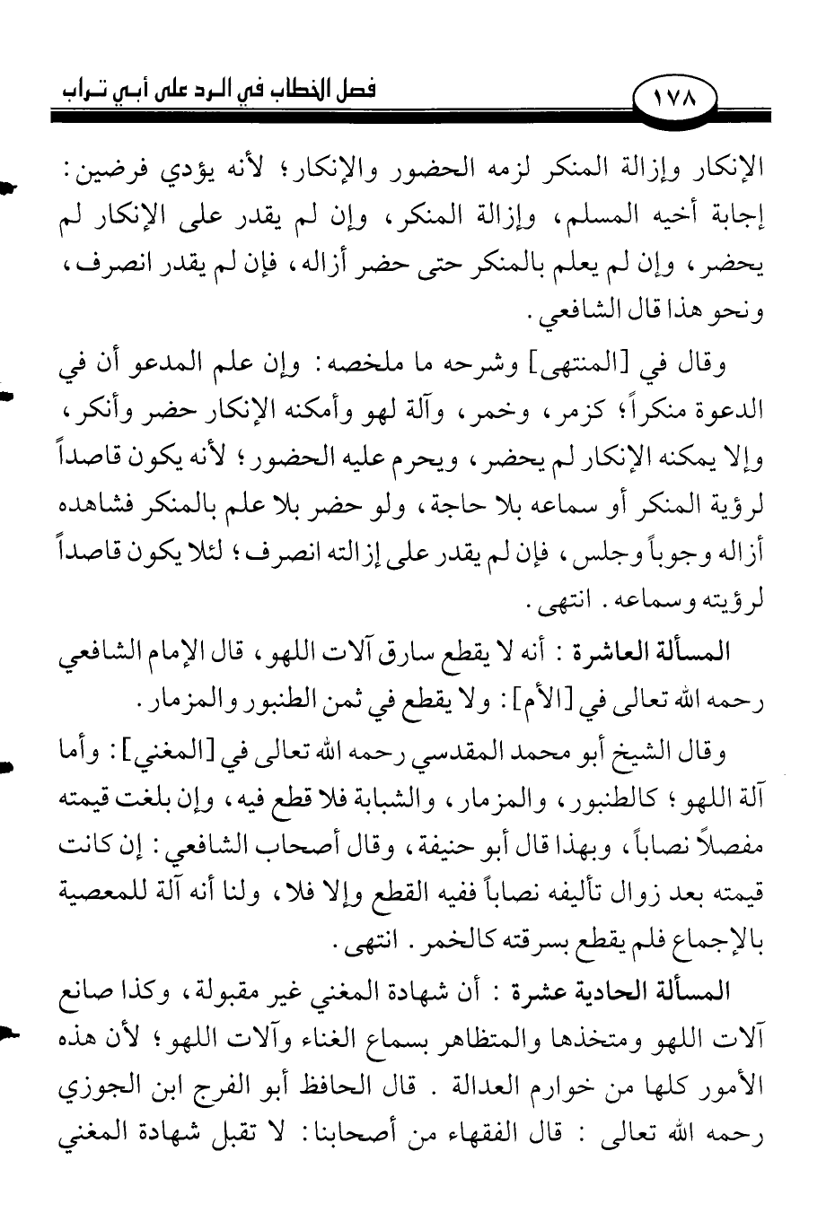 وقال في [المنتهى] وشرحه ما ملخصه: وإن علم المدعو أن في الدعوة منكراً؛ كزمر، وخمر، وآلة لهو وأمكنه الإنكار حضر وأنكر، وإلا يمكنه الإنكار لم يحضر، ويحرم عليه الحضور؛ لأنه يكون قاصداً لرؤية المنكر أو سماعه بلا حاجة، ولو حضر بلا علم بالمنكر فشاهده أزاله وجوباً وجلس، فإن لم يقدر على إزالته انصرف؛ لئلا يكون قاصداً لرؤيته وسماعه. انتهى.