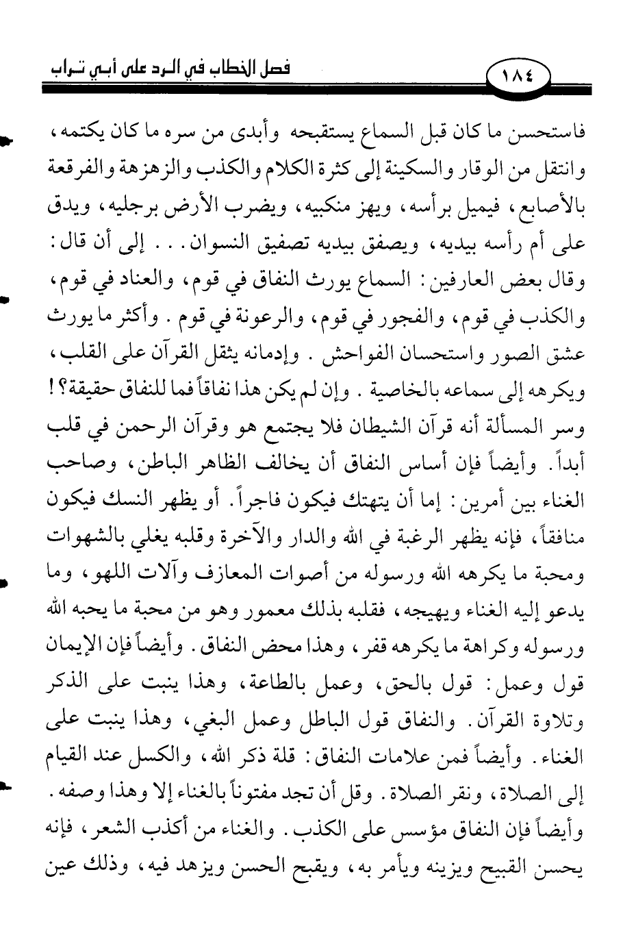 فاستحسن ما كان قبل السماع يستقبحه وأبدى من سره ما كان يكتمه، وانتقل من الوقار والسكينة إلى كثرة الكلام والكذب والزهزهة والفرقعة بالأصابع، فيميل برأسه، ويهز منكبيه، ويضرب الأرض برجليه، ويدق على أم رأسه بيديه، ويصفق بيديه تصفيق النسوان. . . إلى أن قال: وقال بعض العارفين: السماع يورث النفاق في قوم، والعناد في قوم، والكذب في قوم، والفجور في قوم، والرعونة في قوم. وأكثر ما يورث عشق الصور واستحسان الفواحش. وإدمانه يثقل القرآن على القلب، ويكرهه إلى سماعه بالخاصية. وإن لم يكن هذا نفاقاً فما للنفاق حقيقة؟! وسر المسألة أنه قرآن الشيطان فلا يجتمع هو وقرآن الرحمن في قلب أبداً. وأيضاً فإن أساس النفاق أن يخالف الظاهر الباطن، وصاحب الغناء بين أمرين: إما أن يتهتك فيكون فاجراً. أو يظهر النسك فيكون منافقاً، فإنه يظهر الرغبة في الله والدار الآخرة وقلبه يغلي بالشهوات ومحبة ما يكرهه الله ورسوله من أصوات المعازف وآلات اللهو، وما يدعو إليه الغناء ويهيجه، فقلبه بذلك معمور وهو من محبة ما يحبه الله ورسوله وكراهة ما يكرهه قفر، وهذا محض النفاق. وأيضاً فإن الإيمان قول وعمل: قول بالحق، وعمل بالطاعة، وهذا ينبت على الذكر وتلاوة القرآن. والنفاق قول الباطل وعمل البغي، وهذا ينبت على الغناء. وأيضاً فمن علامات النفاق: قلة ذكر الله، والكسل عند القيام إلى الصلاة، ونقر الصلاة. وقل أن تجد مفتوناً بالغناء إلا وهذا وصفه. وأيضاً فإن النفاق مؤسس على الكذب. والغناء من أكذب الشعر، فإنه يحسن القبيح ويزينه ويأمر به، ويقبح الحسن ويزهد فيه، وذلك عين