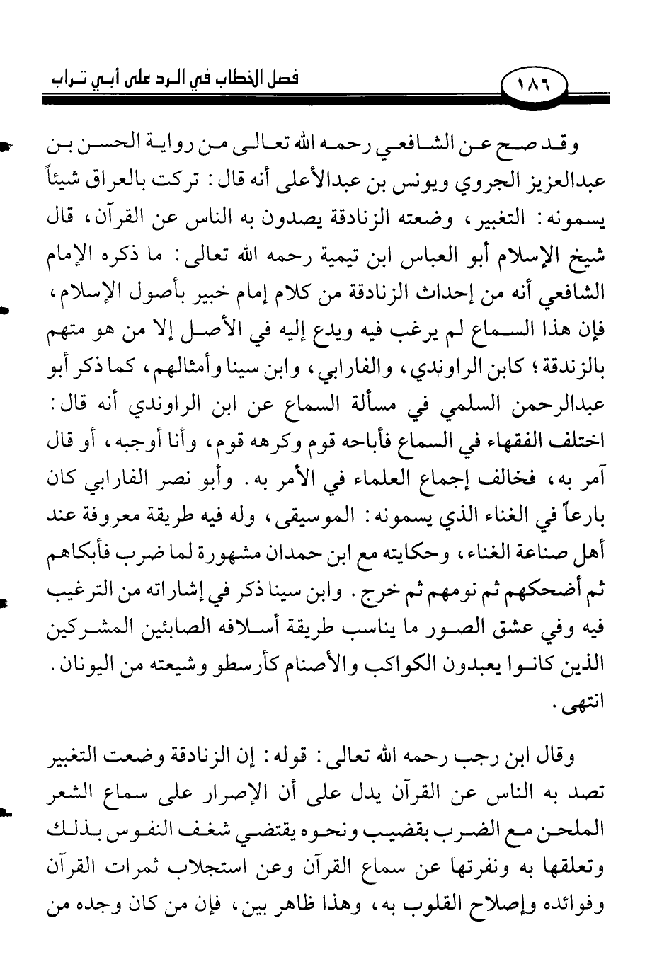 وقد صح عن الشافعي رحمه الله تعالى من رواية الحسن بن عبد العزيز الجروي ويونس بن الأعلى أنه قال: تركت بالعراق شيئاً يسمونه: التغبير، وضعته الزنادقة يصدون به الناس عن القرآن، قال شيخ الإسلام أبو العباس ابن تيمية رحمه الله تعالى: ما ذكره الإمام الشافعي أنه من إحداث الزنادقة من كلام إمام خبير بأصول الإسلام، فإن هذا السماع لم يرغب فيه ويدع إليه في الأصل إلا من هو متهم بالزندقة؛ كابن الراوندي، والفارابي، وابن سينا وأمثالهم، كما ذكر أبو عبد الرحمن السلمي في مسألة السماع عن ابن الراوندي أنه قال: اختلف الفقهاء في السماع فأباحه قوم وكرهه قوم، وأنا أوجبه، أو قال آمر به، فخالف إجماع العلماء في الأمر به. وأبو نصر الفارابي كان بارعاً في الغناء الذي يسمونه: الموسيقى، وله فيه طريقة معروفة عند أهل صناعة الغناء، وحكايته مع ابن حمدان مشهورة لما ضرب فأبكاهم ثم أضحكهم ثم نومهم ثم خرج. وابن سينا ذكر في إشاراته من الترغيب فيه وفي عشق الصور ما يناسب طريقة أسلافه الصابئين المشركين الذين كانوا يعبدون الكواكب والأصنام كأرسطو وشيعته من اليونان. انتهى.