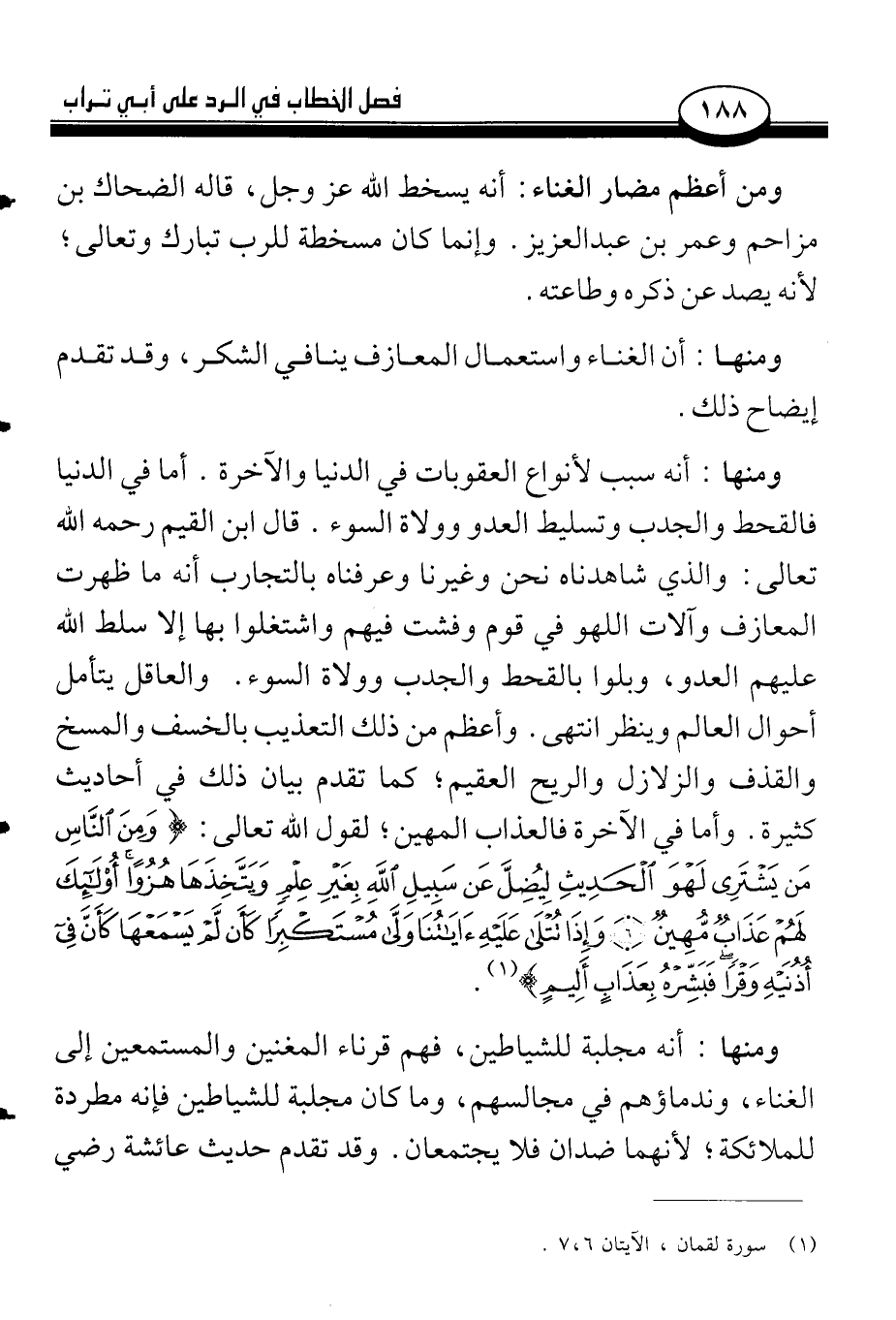 ومنها: أنه سبب لأنواع العقوبات في الدنيا والآخرة. أما في الدنيا فالقحط والجدب وتسليط العدو وولاة السوء. قال ابن القيم رحمه الله تعالى: والذي شاهدناه نحن وغيرنا وعرفناه بالتجارب أنه ما ظهرت المعازف وآلات اللهو في قوم وفشت فيهم واشتغلوا بها إلا سلط الله عليهم العدو، وبلوا بالقحط والجدب وولاة السوء. والعاقل يتأمل أحوال العالم وينظر انتهى. وأعظم من ذلك التعذيب بالخسف والمسخ والقذف والزلازل والريح العقيم؛ كما تقدم بيان ذلك في أحاديث كثيرة. وأما في الآخرة فالعذاب المهين؛ لقول الله تعالى: {وَمِنَ النَّاسِ مَن يَشْتَرِي لَهْوَ الْحَدِيثِ لِيُضِلَّ عَن سَبِيلِ اللَّهِ بِغَيْرِ عِلْمٍ وَيَتَّخِذَهَا هُزُواً أُولَئِكَ لَهُمْ عَذَابٌ مُّهِينٌ (6) وَإِذَا تُتْلَى عَلَيْهِ آيَاتُنَا وَلَّى مُسْتَكْبِراً كَأَن لَّمْ يَسْمَعْهَا كَأَنَّ فِي أُذُنَيْهِ وَقْراً فَبَشِّرْهُ بِعَذَابٍ أَلِيمٍ} (¬1).