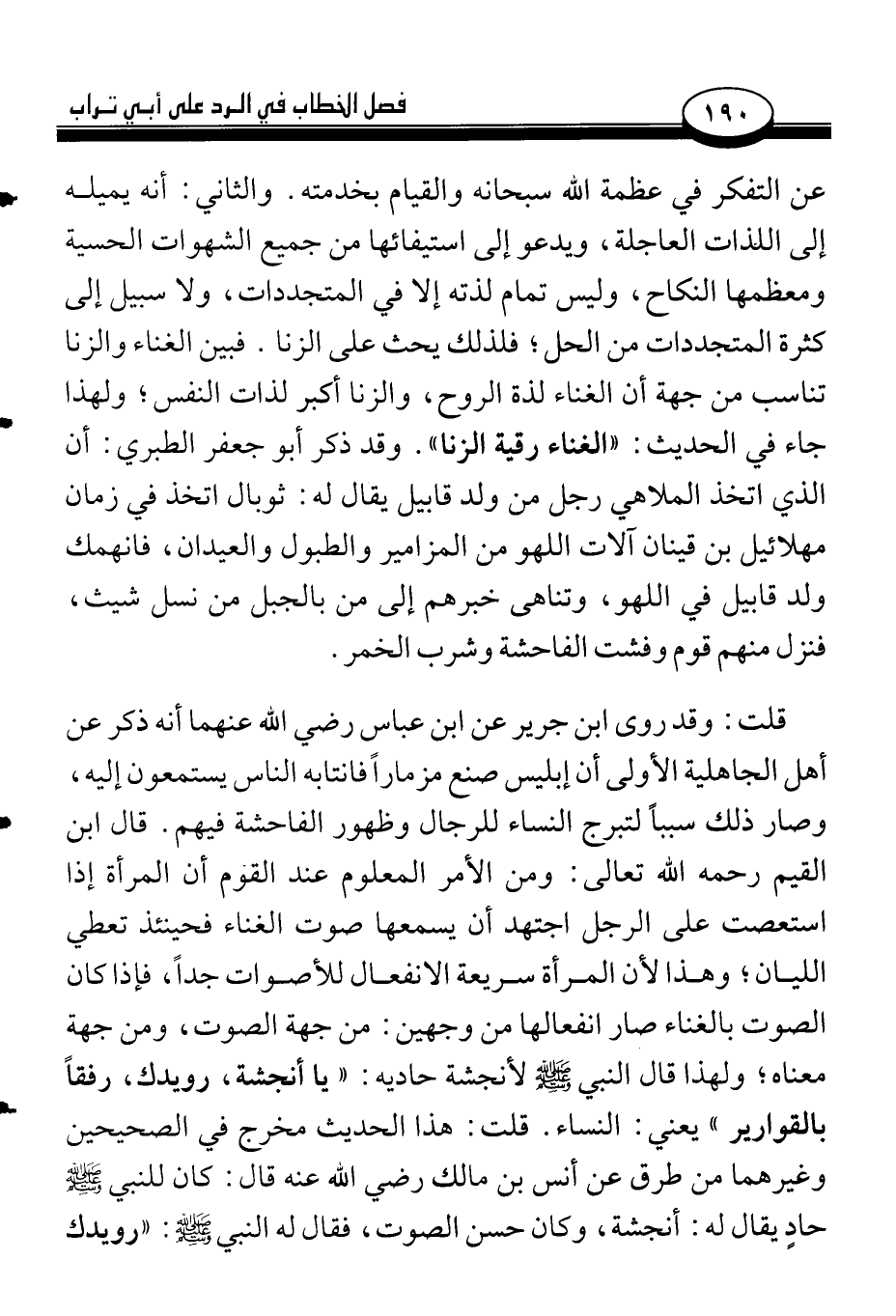 قلت: وقد روى ابن جرير عن ابن عباس رضي الله عنهما أنه ذكر عن أهل الجاهلية الأولى أن إبليس صنع مزماراً فانتابه الناس يستمعون إليه، وصار ذلك سبباً لتبرج النساء للرجال وظهور الفاحشة فيهم. قال ابن القيم رحمه الله تعالى: ومن الأمر المعلوم عند القوم أن المرأة إذا استعصت على الرجل اجتهد أن يسمعها صوت الغناء فحينئذ تعطي الليان؛ وهذا لأن المرأة سريعة الانفعال للأصوات جداً، فإذا كان الصوت بالغناء صار انفعالها من وجهين: من جهة الصوت، ومن جهة معناه؛ ولهذا قال النبي صلى الله عليه وسلم لأنجشة حادية: «يا أنجشة، رويدك، رفقاً بالقوارير» يعني: النساء. قلت: هذا الحديث مخرج في الصحيحين وغيرهما من طرق عن أنس بن مالك رضي الله عنه قال: كان للنبي صلى الله عليه وسلم حادٍ يقال له: أنجشة، وكان حسن الصوت، فقال له النبي صلى الله عليه وسلم: «رويدك