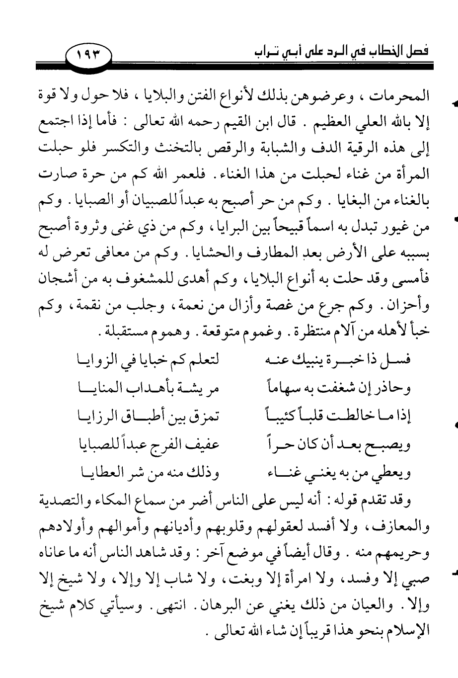 المحرمات، وعرضوهن بذلك لأنواع الفتن والبلايا، فلا حول ولا قوة إلا بالله العلي العظيم. قال ابن القيم رحمه الله تعالى: فأما إذا اجتمع إلى هذه الرقية الدف والشبابة والرقص بالتخنث والتكسر فلو حبلت المرأة من غناء لحبلت من هذا الغناء. فلعمر الله كم من حرة صارت بالغناء من البغايا. وكم من حر أصبح به عبداً للصبيان أو الصبايا. وكم من غيور تبدل به اسماً قبيحاً بين البرايا، وكم من ذي غنى وثروة أصبح بسببه على الأرض بعد المطارف والحشايا. وكم من معافى تعرض له فأمسى وقد حلت به أنواع البلايا، وكم أهدى للمشغوف به من أشجان وأحزان. وكم جرع من غصة وأزال من نعمة، وجلب من نقمة، وكم خبأ لأهله من آلام منتظرة. وغموم متوقعة. وهموم مستقبلة.