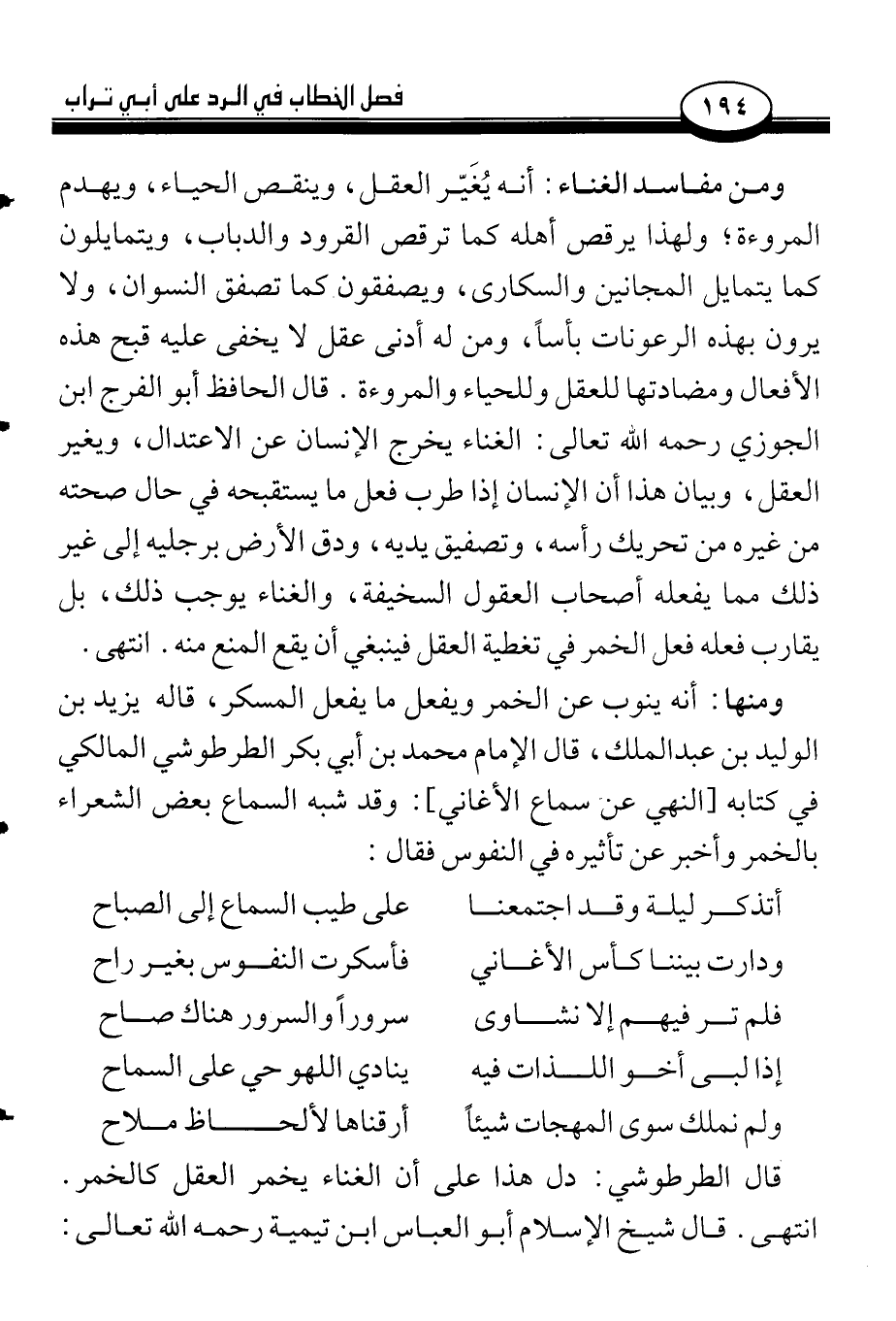 قال الطرطوشي: دل هذا على أن الغناء يخمر العقل كالخمر. انتهى. قال شيخ الإسلام أبو العباس ابن تيمية رحمه الله تعالى: