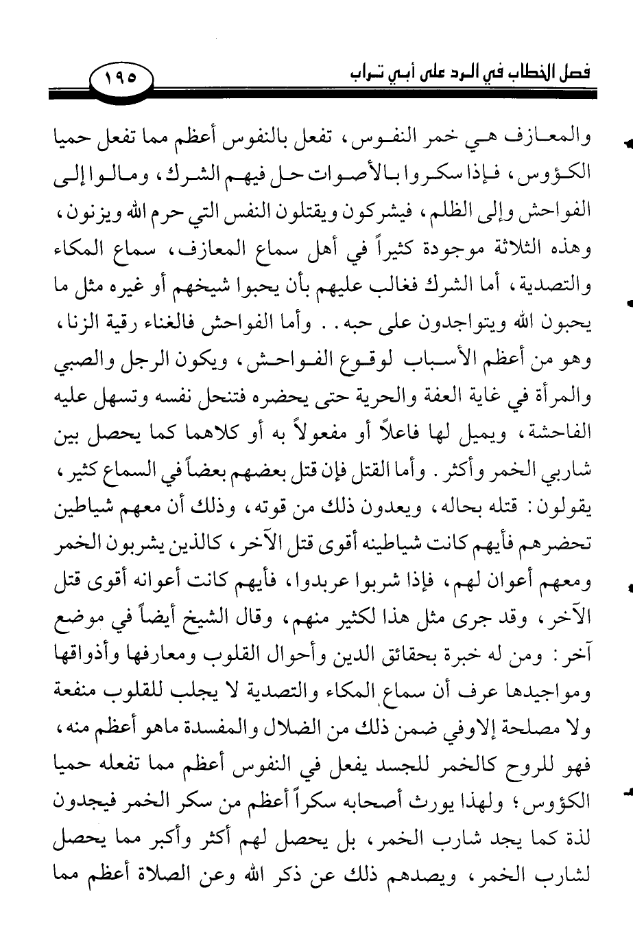 والمعازف هي خمر النفوس، تفعل بالنفوس أعظم مما تفعل حميا الكؤوس، فإذا سكروا بالأصوات حل فيهم الشرك، ومالوا إلى الفواحش وإلى الظلم، فيشركون ويقتلون النفس التي حرم الله ويزنون، وهذه الثلاثة موجودة كثيراً في أهل سماع المعازف، سماع المكاء والتصدية، أما الشرك فغالب عليهم بأن يحبوا شيخهم أو غيره مثل ما يحبون الله ويتواجدون على حبه. . وأما الفواحش فالغناء رقية الزنا، وهو من أعظم الأسباب لوقوع الفواحش، ويكون الرجل والصبي والمرأة في غاية العفة والحرية حتى يحضره فتنحل نفسه وتسهل عليه الفاحشة، ويميل لها فاعلاً أو مفعولاً به أو كلاهما كما يحصل بين شاربي الخمر وأكثر. وأما القتل فإن قتل بعضهم بعضاً في السماع كثير، يقولون: قتله بحاله، ويعدون ذلك من قوته، وذلك أن معهم شياطين تحضرهم فأيهم كانت شياطينه أقوى قتل الآخر، كالذين يشربون الخمر ومعهم أعوان لهم، فإذا شربوا عربدوا، فأيهم كانت أعوانه أقوى قتل الآخر، وقد جرى مثل هذا لكثير منهم، وقال الشيخ أيضاً في موضع آخر: ومن له خبرة بحقائق الدين وأحوال القلوب ومعارفها وأذواقها ومواجيدها عرف أن سماع المكاء والتصدية لا يجلب للقلوب منفعة ولا مصلحة إلا وفي ضمن ذلك من الضلال والمفسدة ما هو أعظم منه، فهو للروح كالخمر للجسد يفعل في النفوس أعظم مما تفعله حميا الكؤوس؛ ولهذا يورث أصحابه سكراً أعظم من سكر الخمر فيجدون لذة كما يجد شارب الخمر، بل يحصل لهم أكثر وأكبر مما يحصل لشارب الخمر، ويصدهم ذلك عن ذكر الله وعن الصلاة أعظم مما