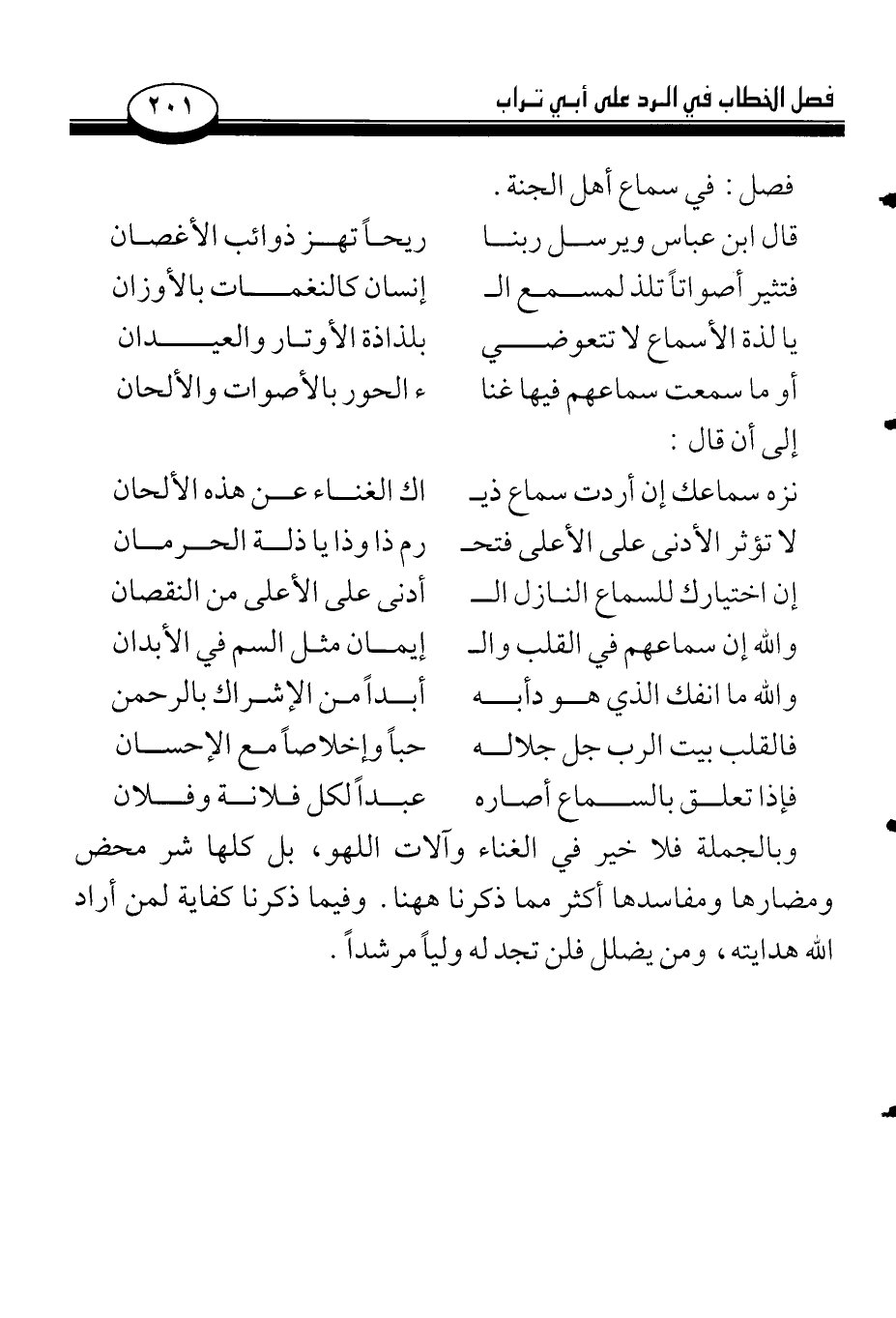 وبالجملة فلا خير في الغناء وآلات اللهو، بل كلها شر محض ومضارها ومفاسدها أكثر مما ذكرنا ههنا. وفيما ذكرنا كفاية لمن أراد الله هدايته، ومن يضلل فلن تجد له ولياً مرشداً.