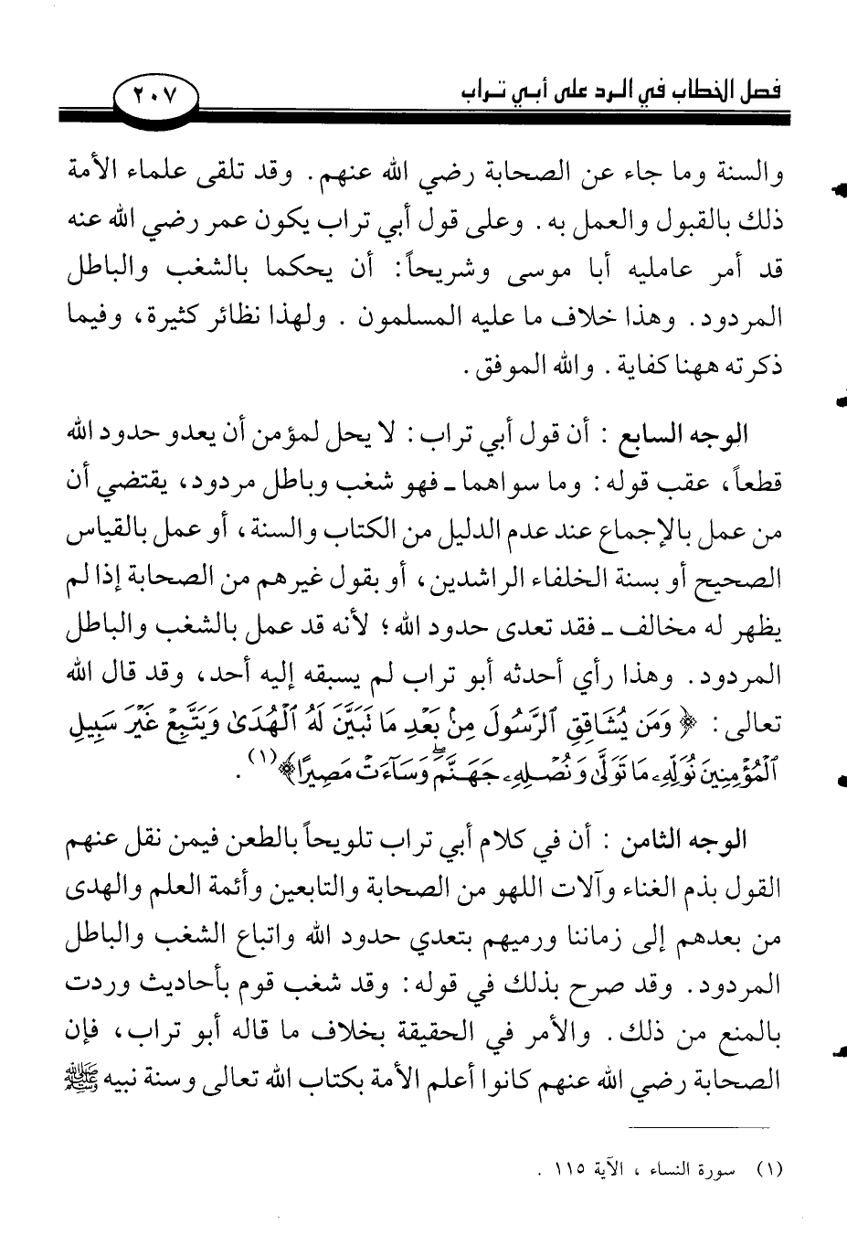 الوجه السابع: أن قول أبي تراب: لا يحل لمؤمن أن يعدو حدود الله قطعاً، عقب قوله: وما سواهما - فهو شغب وباطل مردود، يقتضي أن من عمل بالإجماع عند عدم الدليل من الكتاب والسنة، أو عمل بالقياس الصحيح أو بسنة الخلفاء الراشدين، أو بقول غيرهم من الصحابة إذا لم يظهر له مخالف - فقد تعدى حدود الله؛ لأنه قد عمل بالشغب والباطل المردود. وهذا رأي أحدثه أبو تراب لم يسبقه إليه أحد، وقد قال الله تعالى: {وَمَن يُشَاقِقِ الرَّسُولَ مِن بَعْدِ مَا تَبَيَّنَ لَهُ الْهُدَى وَيَتَّبِعْ غَيْرَ سَبِيلِ الْمُؤْمِنِينَ نُوَلِّهِ مَا تَوَلَّى وَنُصْلِهِ جَهَنَّمَ وَسَاءتْ مَصِيراً} (¬1).