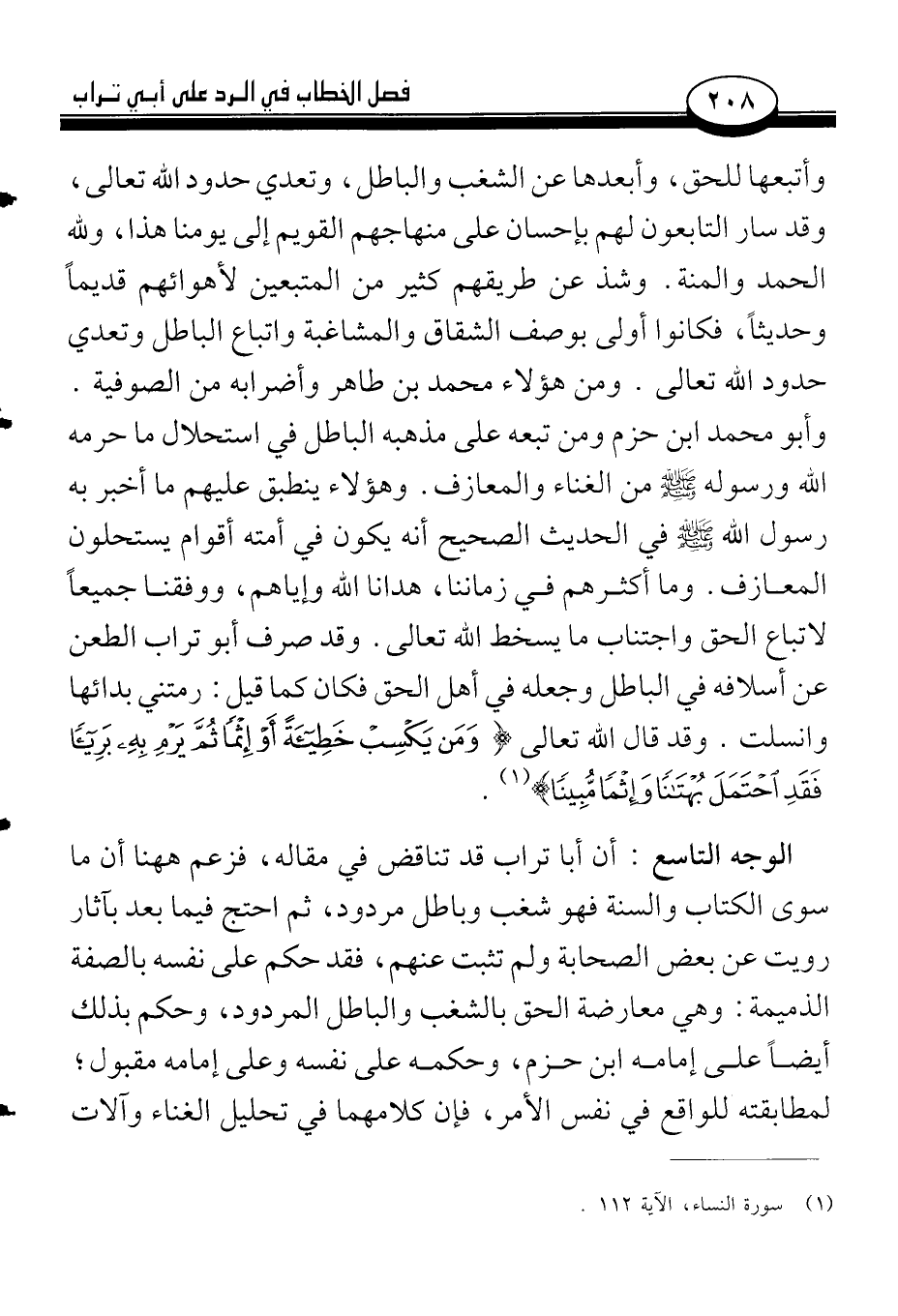 وأتبعها للحق، وأبعدها عن الشغب والباطل، وتعدي حدود الله تعالى، وقد سار التابعون لهم بإحسان على منهاجهم القويم إلى يومنا هذا، ولله الحمد والمنة. وشذ عن طريقهم كثير من المتبعين لهوائهم قديماً وحديثاً، فكانوا أولى بوصف الشقاق والمشاغبة واتباع الباطل وتعدي حدود الله. ومن هؤلاء محمد بن طاهر وأضرابه من الصوفية. وأبو محمد ابن حزم ومن تبعه على مذهبه الباطل في استحلال ما حرمه الله ورسوله صلى الله عليه وسلم من الغناء والمعازف. وهؤلاء ينطبق عليهم ما أخبر به رسول الله صلى الله عليه وسلم في الحديث الصحيح أنه يكون في أمته أقوام يستحلون المعازف. وما أكثرهم في زماننا، هدانا الله وإياهم، ووفقنا جميعاً لاتباع الحق واجتناب ما يسخط الله تعالى. وقد صرف أبو تراب الطعن عن أسلافه في الباطل وجعله في أهل الحق فكان كما قيل: رمتني بدائها وانسلت. وقد قال الله تعالى {وَمَن يَكْسِبْ خَطِيئَةً أَوْ إِثْماً ثُمَّ يَرْمِ بِهِ بَرِيئاً فَقَدِ احْتَمَلَ بُهْتَاناً وَإِثْماً مُّبِيناً} (¬1).