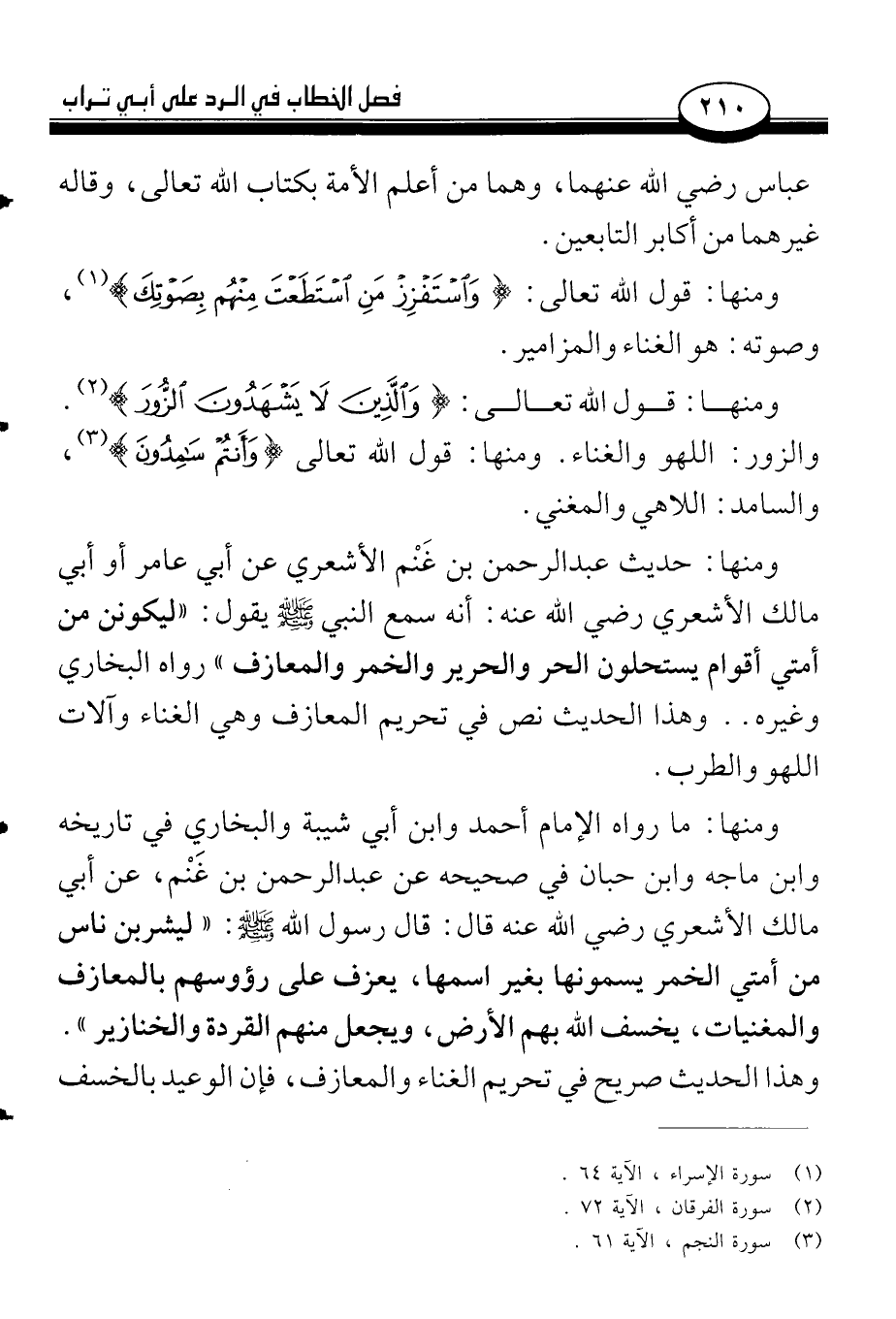 ومنها: قول الله تعالى: {وَالَّذِينَ لَا يَشْهَدُونَ الزُّورَ} (¬2). والزور: اللهو والغناء. ومنها: قول الله تعالى: {وَأَنتُمْ سَامِدُونَ} (¬3)، والسامد: اللاهي والمغني.
