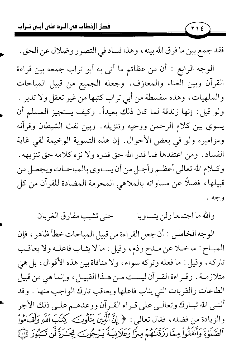 الوجه الرابع: أن من عظائم ما أتى به أبو تراب جمعه بين قراءة القرآن وبين الغناء والمعازف، وجعله الجميع من قبيل المباحات والملهيات، وهذه سفسطة من أبي تراب كتبها من غير تعقل ولا تدبر. ولو قيل: إنها زندقة لما كان ذلك بعيداً. وكيف يستجيز المسلم أن يسوي بين كلام الرحمن ووحيه وتنزيله. وبين نفث الشيطان وقرآنه ومزاميره ولو في بعض الأحوال. إن هذه التسوية الوخيمة لفي غاية الفساد. ومن اعتقدها فما قدر الله حق قدره ولا نزه كلامه حق تنزيهه. وكلام الله تعالى أعظم وأجل من أن يساوى بالمباحات ويجعل من قبيلها، فضلاً عن مساواته بالملاهي المحرمة المضادة للقرآن من كل وجه.