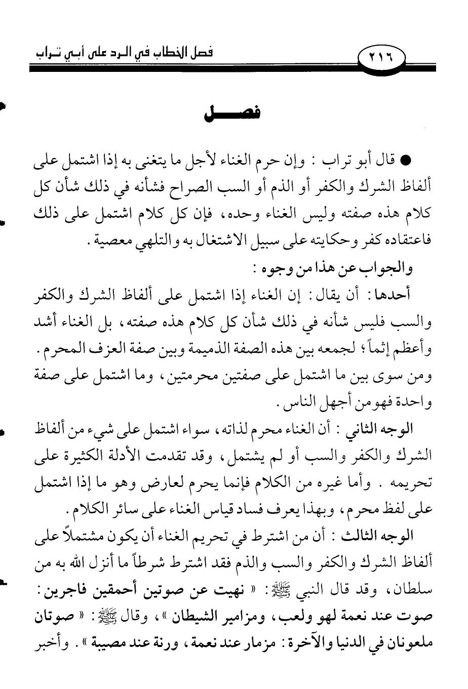 الوجه الثالث: أن من اشترط في تحريم الغناء أن يكون مشتملاً على ألفاظ الشرك والكفر والسب والذم فقد اشترط شرطاً ما أنزل الله به من سلطان، وقد قال النبي صلى الله عليه وسلم: «نهيت عن صوتين أحمقين فاجرين: صوت عند نعمة لهو ولعب، ومزامير الشيطان»، وقال صلى الله عليه وسلم: «صوتان ملعونان في الدنيا والآخرة: مزمار عند نعمة، ورنة عند مصيبة». وأخبر