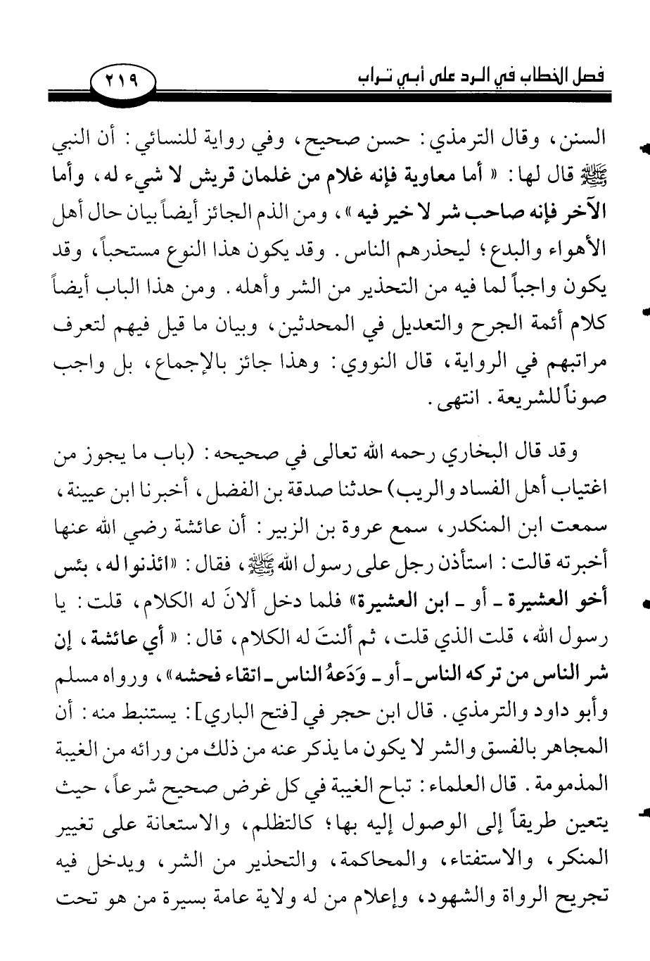 السنن، وقال الترمذي: حسن صحيح، وفي رواية للنسائي: أن النبي صلى الله عليه وسلم قال لها: «أما معاوية فإن غلام من غلمان قريش لا شيء له، وأما الآخر فإنه صاحب شر لا خير فيه»، ومن الذم الجائز أيضاً بيان حال أهل الأهواء والبدع؛ ليحذرهم الناس. وقد يكون هذا النوع مستحباً، وقد يكون واجباً لما فيه من التحذير من الشر وأهله. ومن هذا الباب أيضاً كلام أئمة الجرح والتعديل في المحدثين، وبيان ما قيل فيهم لتعرف مراتبهم في الرواية، قال النووي: وهذا جائز بالإجماع، بل واجب صوناً للشريعة. انتهى.