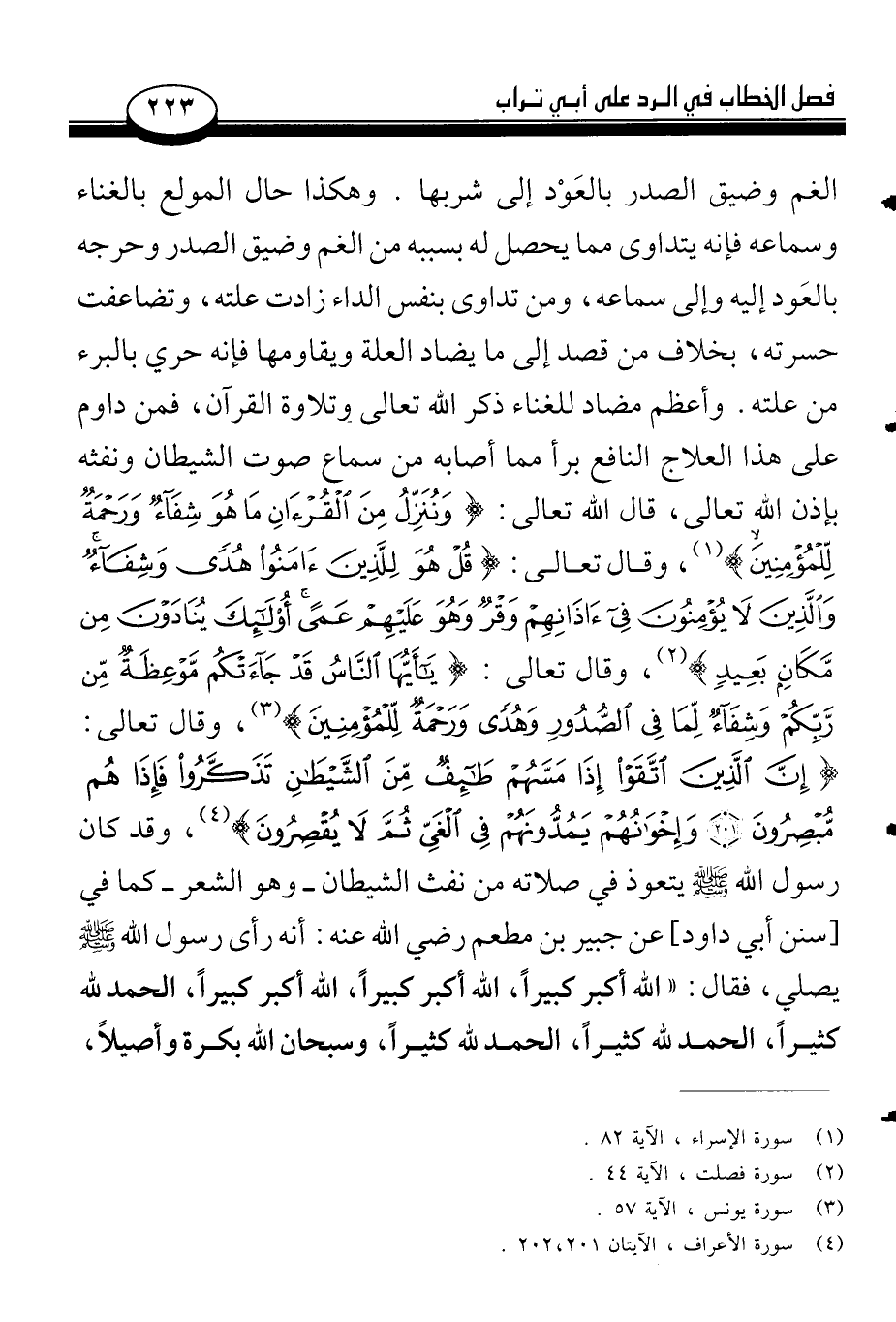 الغم وضيق الصدر بالعَوْد إلى شربها. وهكذا حال المولع بالغناء وسماعه فإنه يتداوى مما يحصل له بسببه من الغم وضيق الصدر حرجه بالعَود إليه وإلى سماعه، ومن تداوى بنفس الداء زادت علته، وتضاعفت حسرته، بخلاف من قصد إلى ما يضاد العلة ويقاومها فإنه حري بالبرء من علته. وأعظم مضاد للغناء ذكر الله تعالى وتلاوة القرآن، فمن داوم على هذا العلاج النافع برأ مما أصابه من سماع صوت الشيطان ونفثه بإذن الله تعالى، قال الله تعالى: {وَنُنَزِّلُ مِنَ الْقُرْآنِ مَا هُوَ شِفَاء وَرَحْمَةٌ لِّلْمُؤْمِنِينَ} (¬1)، وقال تعالى: {قُلْ هُوَ لِلَّذِينَ آمَنُوا هُدًى وَشِفَاء وَالَّذِينَ لَا يُؤْمِنُونَ فِي آذَانِهِمْ وَقْرٌ وَهُوَ عَلَيْهِمْ عَمًى أُوْلَئِكَ يُنَادَوْنَ مِن مَّكَانٍ بَعِيدٍ} (¬2)، وقال تعالى: {يَا أَيُّهَا النَّاسُ قَدْ جَاءتْكُم مَّوْعِظَةٌ مِّن رَّبِّكُمْ وَشِفَاء لِّمَا فِي الصُّدُورِ وَهُدًى وَرَحْمَةٌ لِّلْمُؤْمِنِينَ} (¬3)، وقال تعالى: {إِنَّ الَّذِينَ اتَّقَوا إِذَا مَسَّهُمْ طَائِفٌ مِّنَ الشَّيْطَانِ تَذَكَّرُوا فَإِذَا هُم مُّبْصِرُونَ (201) وَإِخْوَانُهُمْ يَمُدُّونَهُمْ فِي الْغَيِّ ثُمَّ لاَ يُقْصِرُونَ} (¬4)، وقد كان رسول الله صلى الله علبه وسلم يتعوذ في صلاته من نفث الشيطان - وهو الشعر - كما في [سنن أبي داود] عن جبير بن مطعم رضي الله عنه: أنه رأى رسول الله صلى الله عليه وسلم يصلي، فقال: «الله أكبر كبيراً، الله أكبر كبيراً، الله أكبر كبيراً، الحمد لله كثيراً، الحمد لله كثيراً، الحمد لله كثيراً، وسبحان الله بكرة وأصيلاً،