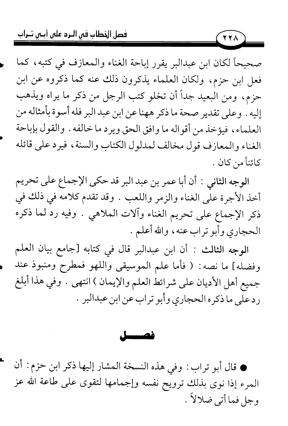 الوجه الثالث: أن ابن عبد البر قال في كتابه [جامع بيان العلم وفضله] ما نصه: (فأما علم الموسيقى واللهو فمطرح ومنبوذ عند جميع أهل الأديان على شرائط العلم والإيمان) انتهى. وفي هذا أبلغ رد على ما ذكره الحجاري وأبو تراب عن ابن عبد البر.