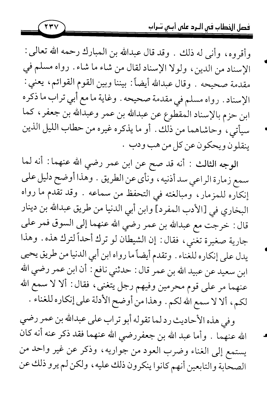 الوجه الثالث: أنه قد صح عن ابن عمر رضي الله عنهما: أنه لما سمع زمارة الراعي سد أذنيه، ونأى عن الطريق. وهذا أوضح دليل على إنكاره للمزمار، ومبالغته في التحفظ من سماعه. وقد تقدم ما رواه البخاري في [الأدب المفرد] وابن أبي الدنيا من طريق عبد الله بن دينار قال: خرجت مع عبد الله بن عمر رضي الله عنهما إلى السوق فمر على جارية صغيرة تغني، فقال: إن الشيطان لو ترك أحداً لترك هذه. وهذا يدل على إنكاره للغناء. وتقدم أيضاً ما رواه ابن أبي الدنيا من طريق يحيى ابن سعيد عن عبيد الله بن عمر قال: حدثني نافع: أن ابن عمر رضي الله عنهما مر على قوم محرمين وفيهم رجل يتغنى، فقال: ألا لا سمع الله لكم، ألا لا سمع الله لكم. وهذا من أوضح الأدلة على إنكاره للغناء.