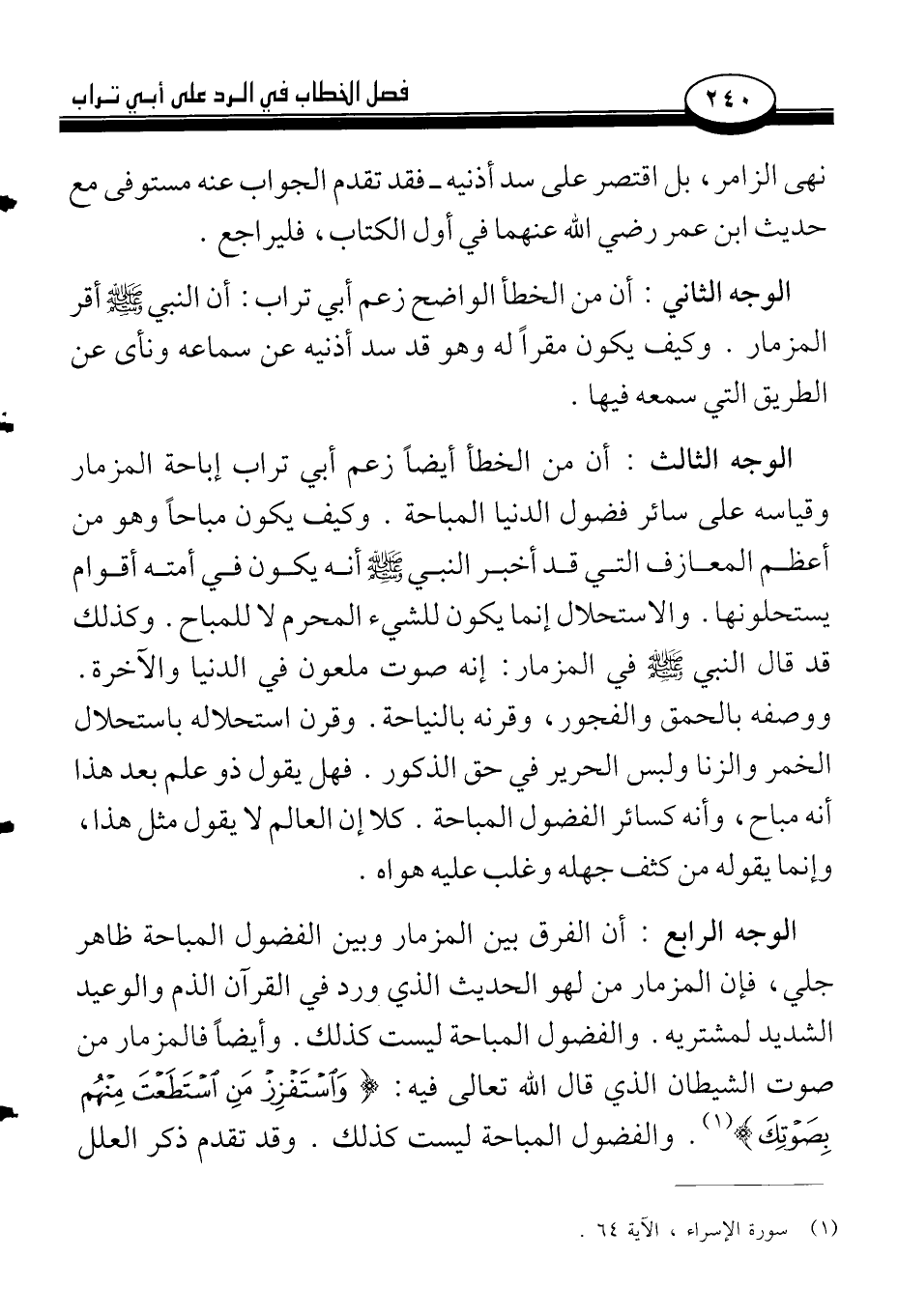 الوجه الثالث: أن من الخطأ أيضاً زعم أبي تراب إباحة المزمار وقياسه على سائر فضول الدنيا المباحة. وكيف يكون مباحاً وهو من أعظم المعازف التي قد أخبر النبي صلى الله عليه وسلم أنه يكون في أمته أقوام يستحلونها. والاستحلال إنما يكون للشيء المحرم لا للمباح. وكذلك قال النبي صلى الله عليه وسلم في المزمار: إنه صوت ملعون في الدنيا والآخرة. ووصفه بالحمق والفجور، وقرنه بالنياحة. وقرن استحلاله باستحلال الخمر والزنا ولبس الحرير في حق الذكور. فهل يقول ذو علم بعد هذا أنه مباح، وأنه كسائر الفضول المباحة. كلا إن العالم لا يقول مثل هذا، وإنما يقوله من كثف جهله وغلب عليه هواه.
