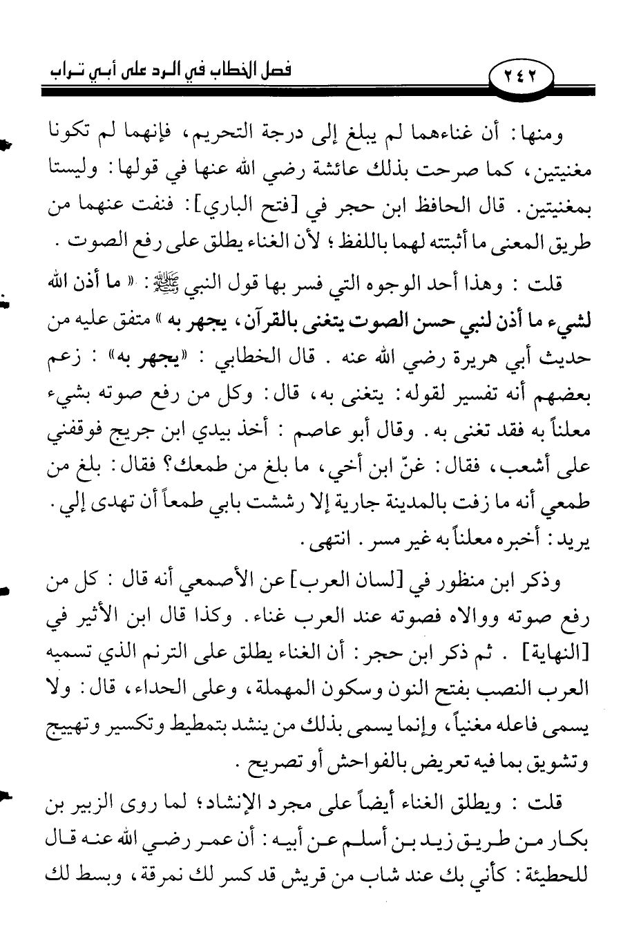 قلت: وهذا أحد الوجوه التي فسر بها قول النبي صلى الله عليه وسلم: «ما أذن الله لشيء ما أذن لنبي حسن الصوت يتغنى بالقرآن، يجهر به» متفق عليه من حديث أبي هريرة رضي الله عنه. قال الخطابي: «يجهر به»: زعم بعضهم أنه تفسير لقوله: يتغنى به، قال: وكل من رفع صوته بشيء معلناً به فقد تغنى به. وقال أبو عاصم: أخذ بيدي ابن جريج فوقفني على أشعب، فقال: غنّ ابن أخي، ما بلغ من طمعك؟ فقال: بلغ من طمعي أنه ما زفت بالمدينة جارية إلا رششت بابي طمعاً أن تهدى إلي. يريد: أخبره معلناً به غير مسر. انتهى.