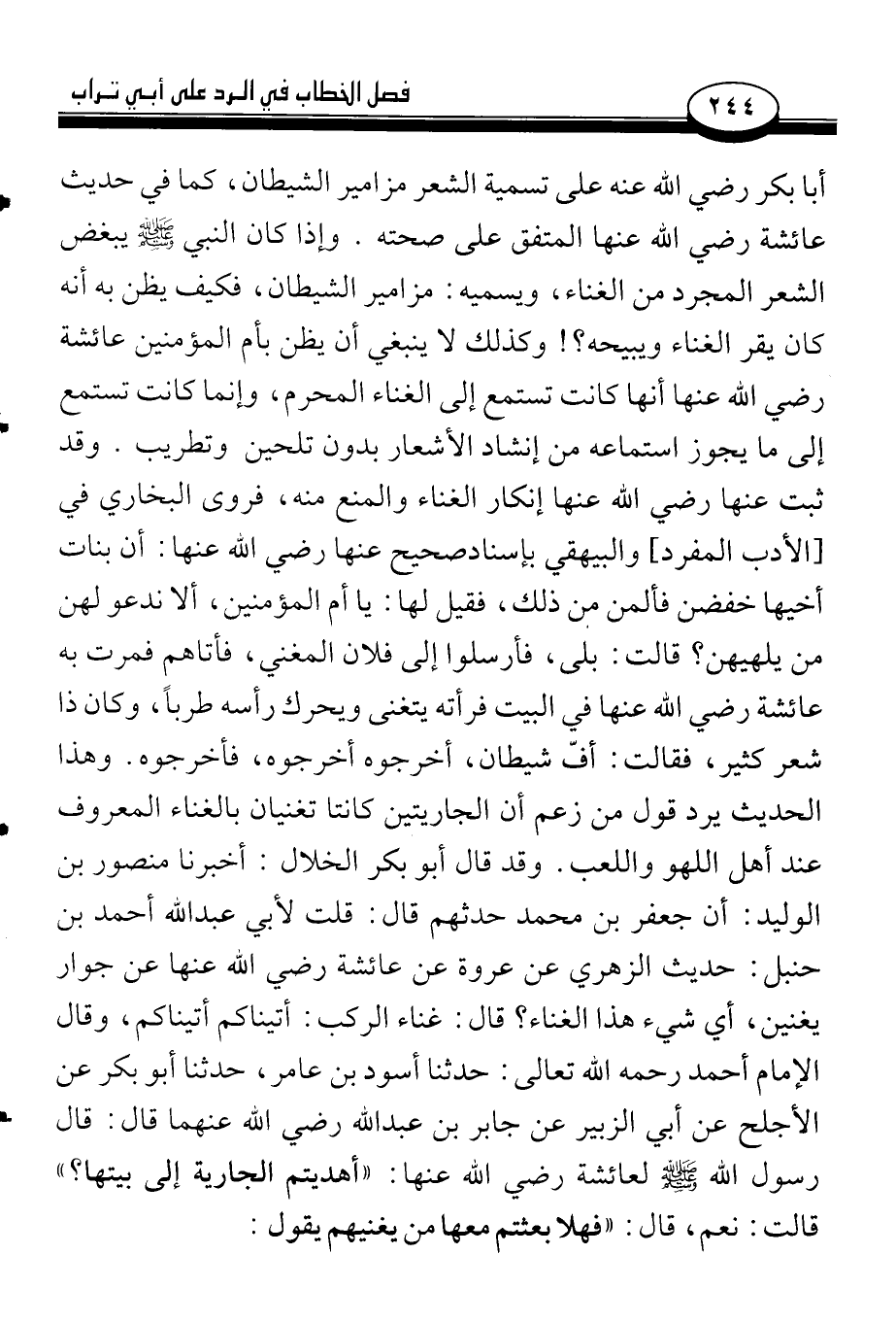 أبا بكر رضي الله عنه على تسمية الشعر مزامير الشيطان، كما في حديث عائشة رضي الله عنها المتفق على صحته. وإذا كان النبي صلى الله عليه وسلم يبغض الشعر المجرد من الغناء، ويسميه: مزامير الشيطان، فكيف يظن به أنه كان يقر الغناء ويبيحه؟! وكذلك لا ينبغي أن يظن بأم المؤمنين عائشة رضي الله عنها أنها كانت تستمع إلى الغناء المحرم، وإنما كانت تستمع إلى ما يجوز استماعه من إنشاد الأشعار بدون تلحين وتطريب. وقد ثبت عنها رضي الله عنها إنكار الغناء والمنع منه، فروى البخاري في [الأدب المفرد] والبيهقي بإسناد صحيح عنها رضي الله عنها: أن بنات أخيها خفضن فألمن من ذلك، فقيل لها: يا أم المؤمنين، ألا ندعو لهن من يلهيهن؟ قالت: بلى، فأرسلوا إلى فلان المغني، فأتاهم فمرت به عائشة رضي الله عنها في البيت فرأته يتغنى ويحرك رأسه طرباً، وكان ذا شعر كثير، فقالت: أفّ شيطان، أخرجوه أخرجوه، فأخرجوه. وهذا الحديث يرد قول من زعم أن الجاريتين كانتا تغنيان بالغناء المعروف عند أهل اللهو واللعب. وقد قال أبو بكر الخلال: أخبرنا منصور بن الوليد: أن جعفر بن محمد حدثهم قال: قلت لأبي عبد الله أحمد بن حنبل: حديث الزهري عن عروة عن عائشة رضي الله عنها عن جوار يغنين، أي شيء هذا الغناء؟ قال: غناء الركب: أتيناكم أتيناكم، وقال الإمام أحمد رحمه الله تعالى: حدثنا أسود بن عامر، حدثنا أبو بكر عن الأجلح عن أبي الزبير عن جابر بن عبد الله رضي الله عنهما قال: قال رسول الله صلى الله عليه وسلم لعائشة رضي الله عنها: «أهديتم الجارية إلى بيتها؟» قالت: نعم، قال: «فهلا بعثتم معها من يغنيهم يقول:
