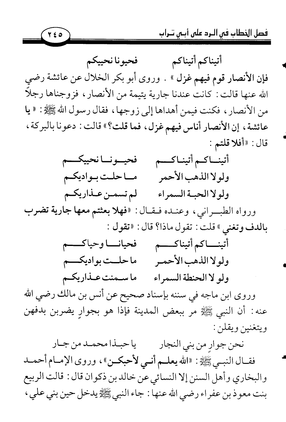 فإن الأنصار قوم فيهم غزل». وروى أبو بكر الخلال عن عائشة رضي الله عنها قالت: كانت عندنا جارية يتيمة من الأنصار، فزوجناها رجلاً من الأنصار، فكنت فيمن أهداها إلى زوجها، فقال رسول الله صلى الله عليه وسلم: «يا عائشة، إن الأنصار أناس فيهم غزل، فما قلت؟» قالت: دعونا بالبركة، قال: «أفلا قلتم: