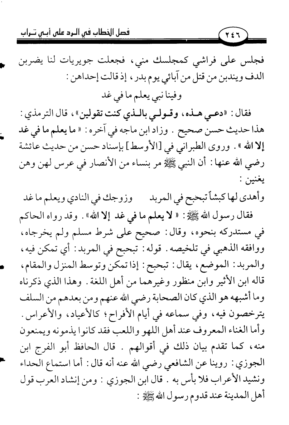 فقال رسول الله صلى الله عليه وسلم: «لا يعلم ما في غد إلا الله». وقد رواه الحاكم في مستدركه بنحوه، وقال: صحيح على شرط مسلم ولم يخرجاه، ووافقه الذهبي في تلخيصه. قوله: تبحبح في المربد: أي تمكن فيه، والمربد: الموضع، يقال: تبحبح: إذا تمكن وتوسط المنزل والمقام، قاله ابن الأثير وابن منظور وغيرهما من أهل اللغة. وهذا الذي ذكرناه وما أشبهه هو الذي كان الصحابة رضي الله عنهم ومن بعدهم من السلف يترخصون فيه، وفي سماعه في أيام الأفراح؛ كالأعياد، والأعراس. وأما الغناء المعروف عند أهل اللهو واللعب فقد كانوا يذمونه ويمنعون منه، كما تقدم بيان ذلك في أقوالهم. قال الحافظ أبو الفرج ابن الجوزي: روينا عن الشافعي رضي الله عنه أنه قال: أما استماع الحداء ونشيد الأعراب فلا بأس به. قال ابن الجوزي: ومن إنشاد العرب قول أهل المدينة عند قدوم رسول الله صلى الله عليه وسلم: