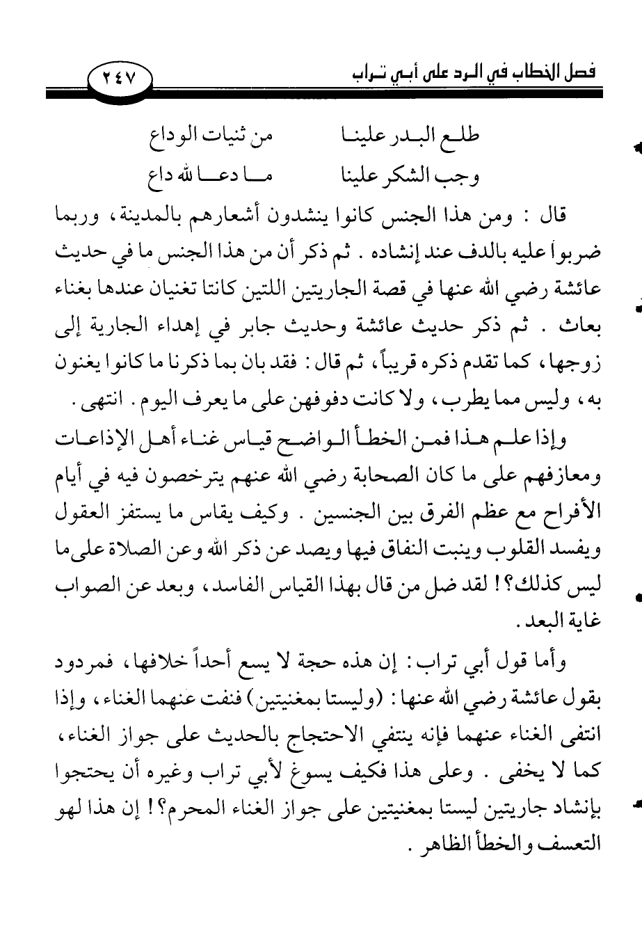 وأما قول أبي تراب: إن هذه حجة لا يسع أحداً خلافها، فمردود بقول عائشة رضي الله عنها: (وليستا بمغنيتين) فنفت عنهما الغناء، وإذا انتفى الغناء عنهما فإنه ينتفي الاحتجاج بالحديث على جواز الغناء، كما لا يخفى. وعلى هذا فكيف يسوغ لأبي تراب وغيره أن يحتجوا بإنشاد جاريتين ليستا بمغنيتين على جواز الغناء المحرم؟! إن هذا لهو التعسف والخطأ الظاهر.