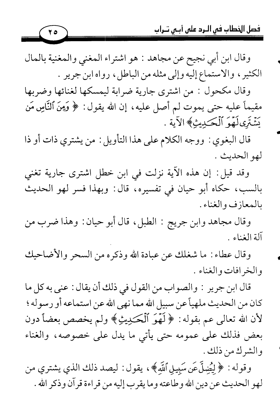 قال ابن جرير: والصواب من القول في ذلك أن يقال: عنى به كل ما كان من الحديث ملهياً عن سبيل الله مما نهى الله عن استماعه أو رسوله؛ لأن الله تعالى عم بقوله: {لَهْوَ الْحَدِيثِ} ولم يخصص بعضاً دون بعض فذلك على عمومه حتى يأتي ما يدل على خصوصه، والغناء والشرك من ذلك.