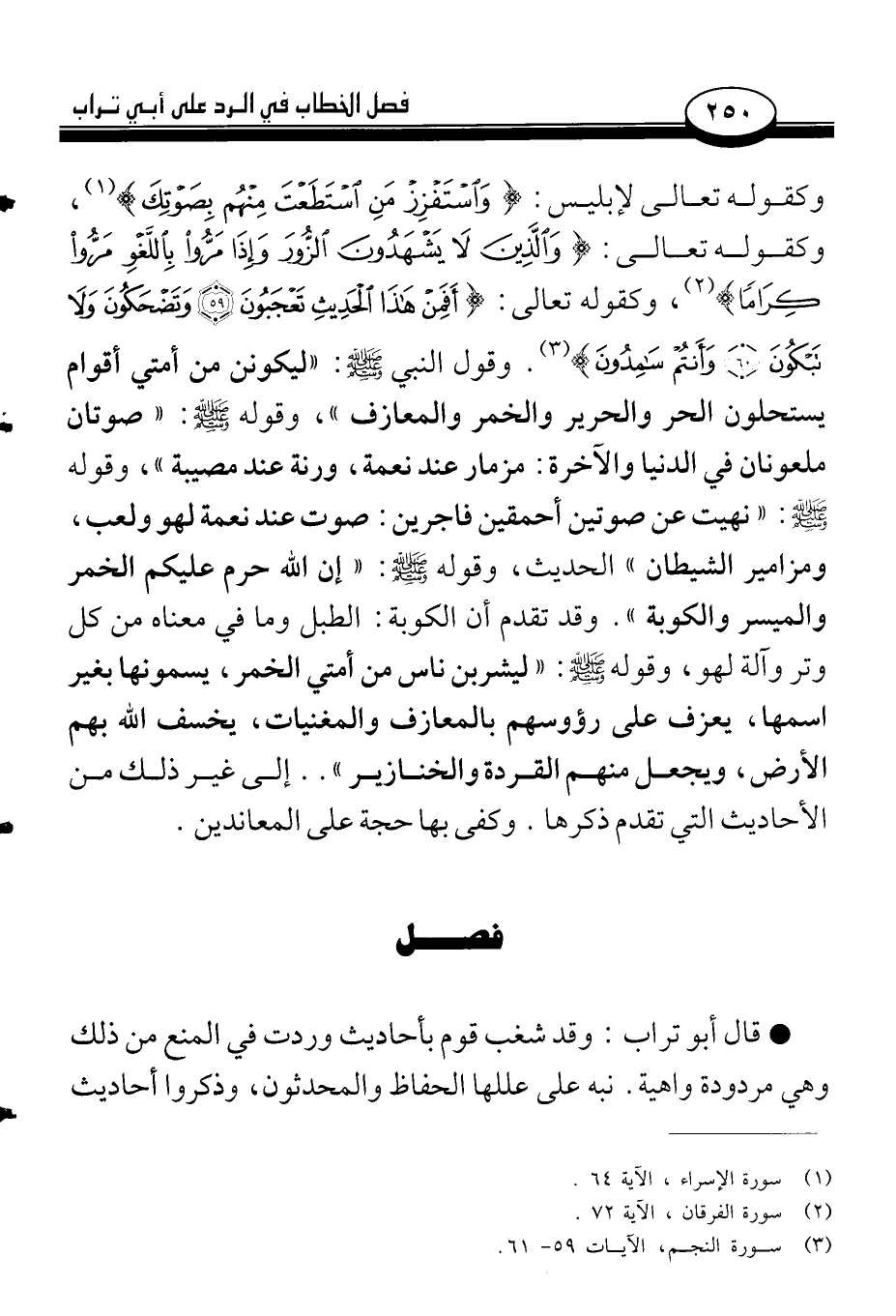 وكقوله تعالى لإبليس: {وَاسْتَفْزِزْ مَنِ اسْتَطَعْتَ مِنْهُمْ بِصَوْتِكَ} (¬1)، وكقوله تعالى: {وَالَّذِينَ لَا يَشْهَدُونَ الزُّورَ وَإِذَا مَرُّوا بِاللَّغْوِ مَرُّوا كِرَاماً} (¬2). وكقوله تعالى: {أَفَمِنْ هَذَا الْحَدِيثِ تَعْجَبُونَ (59) وَتَضْحَكُونَ وَلَا تَبْكُونَ (60) وَأَنتُمْ سَامِدُونَ} (¬3). وقول النبي صلى الله عليه وسلم: «ليكونن من أمتي أقوام يستحلون الحر والحرير والخمر والمعازف»، وقوله صلى الله عليه وسلم: «صوتان ملعونان في الدنيا والآخرة: مزمار عند نعمة، ورنة عند مصيبة»، وقوله صلى الله عليه وسلم: «نهيت عن صوتين أحمقين فاجرين: صوت عند نعمة لهو ولعب، ومزامير الشيطان» الحديث، وقوله صلى الله عليه وسلم: «إن الله حرم عليكم الخمر والميسر والكوبة». وقد تقدم أن الكوبة: الطبل وما في معناه من كل وتر وآلة لهو، وقوله صلى الله عليه وسلم: «ليشربن ناس من أمتي الخمر، يسمونها بغير اسمها، يعزف على رؤوسهم بالمعازف والمغنيات، يخسف الله بهم الأرض، ويجعل منهم القردة والخنازير». . إلى غير ذلك من الأحاديث التي تقدم ذكرها. وكفى بها حجة على المعاندين.