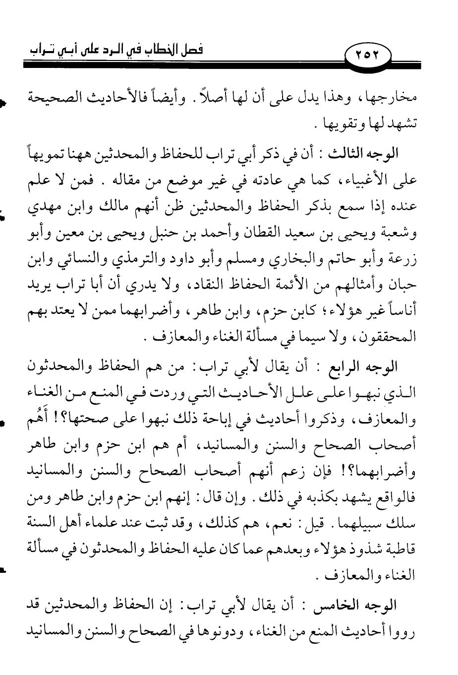 الوجه الرابع: أن يقال لأبي تراب: من هم الحفاظ والمحدثون الذي نبهوا على علل الأحاديث التي وردت في المنع من الغناء والمعازف، وذكروا أحاديث في إباحة ذلك نبهوا على صحتها؟! أَهُم أصحاب الصحاح والسنن والمسانيد، أم هم ابن حزم وابن طاهر وأضرابهما؟! فإن زعم أنهم أصحاب الصحاح والسنن والمسانيد فالواقع يشهد بكذبه في ذلك. وإن قال: إنهم ابن حزم وابن طاهر ومن سلك سبيلهما. قيل: نعم، هم كذلك، وقد ثبت عند علماء أهل السنة قاطبة شذوذ هؤلاء وبعدهم عما كان عليه الحفاظ والمحدثون في مسألة الغناء والمعازف.
