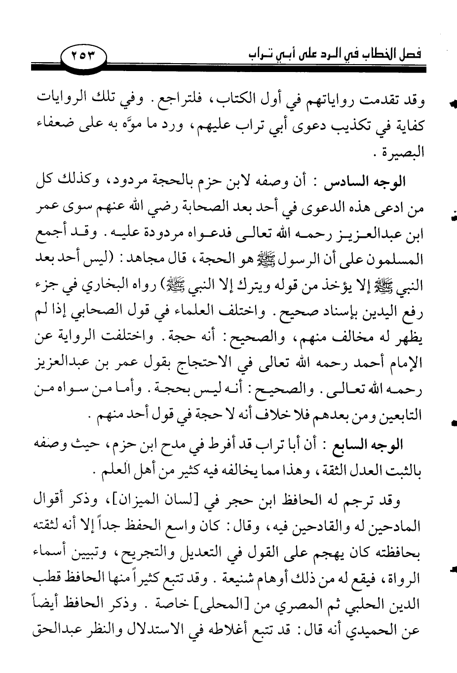 الوجه السادس: أن وصفه لابن حزم بالحجة مردود، وكذلك كل من ادعى هذه الدعوى في أحد بعد الصحابة رضي الله عنهم سوى عمر ابن عبد العزيز رحمه الله تعالى فدعواه مردودة عليه. وقد أجمع المسلمون على أن الرسول صلى الله عليه وسلم هو الحجة، قال مجاهد: (ليس أحد بعد النبي صلى الله عليه وسلم إلا يؤخذ من قوله ويترك إلا النبي صلى الله عليه وسلم) رواه البخاري في جزء رفع اليدين بإسناد صحيح. واختلف العلماء في قول الصحابي إذا لم يظهر له مخالف منهم، والصحيح: أنه حجة. واختلفت الرواية عن الإمام أحمد رحمه الله تعالى في الاحتجاج بقول عمر بن عبد العزيز رحمه الله تعالى. والصحيح: أنه ليس بحجة. وأما من سواه من التابعين ومن بعدهم فلا خلاف أنه لا حجة في قول أحد منهم.