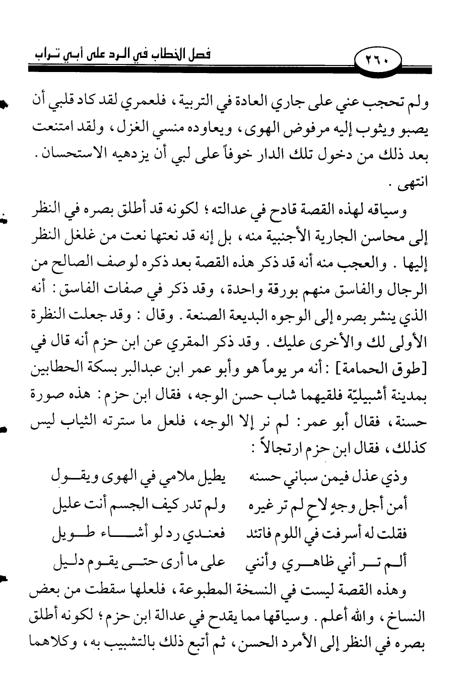 وسياقه لهذه القصة قادح في عدالته؛ لكونه قد أطلق بصره في النظر إلى محاسن الجارية الأجنبية منه، بل إنه قد نعتها نعت من غلغل النظر إليها. والعجب منه أنه قد ذكر هذه القصة بعد ذكره لوصف الصالح من الرجال والفاسق منهم بورقة واحدة، وقد ذكر في صفات الفاسق: أنه الذي ينشر بصره إلى الوجوه البدعية الصنعة. وقال: وقد جعلت النظرة الأولى لك والأخرى عليك. وقد ذكر المقري عن ابن حزم أنه قال في [طوق الحمامة]: أنه مر يوماً هو وأبو عمر ابن عبد البر بسكة الحطابين بمدينة أشبيليّة فلقيهما شاب حسن الوجه، فقال ابن حزم: هذه صورة حسنة، فقال أبو عمر: لم نر إلا الوجه، فلعل ما سترته الثياب ليس كذلك، فقال ابن حزم ارتجالاً: