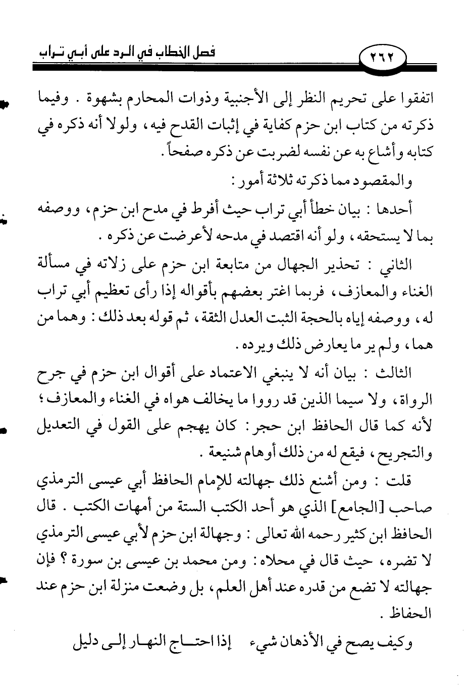 الثاني: تحذير الجهال من متابعة ابن حزم على زلاته في مسألة الغناء والمعازف، فربما اغتر بعضهم بأقواله إذا رأى تعظيم أبي تراب له، ووصفه إياه بالحجة الثبت العدل الثقة، ثم قوله بعد ذلك: وهما من هما، ولم ير ما يعارض ذلك ويرده.