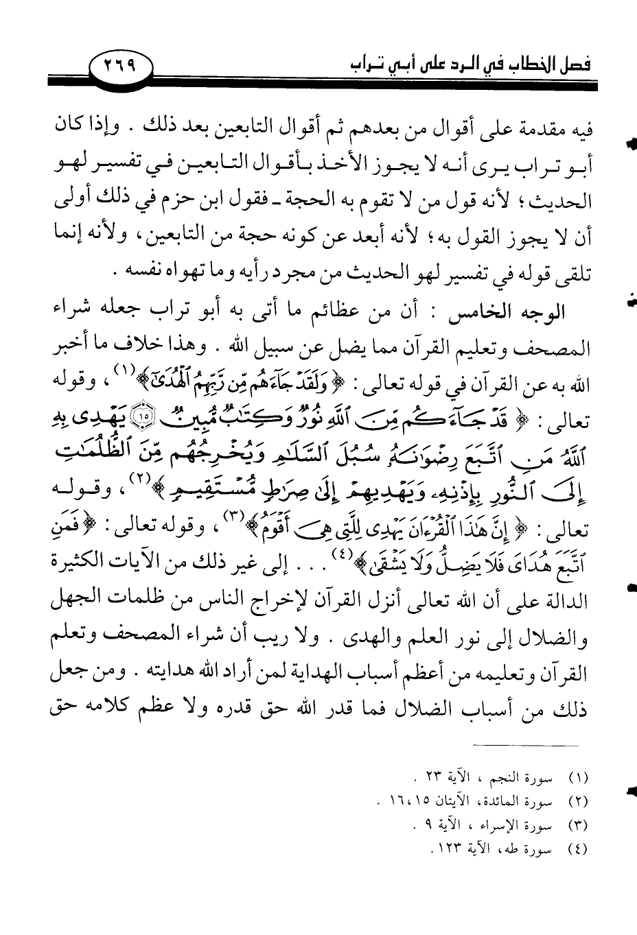 الوجه الخامس: أن من عظائم ما أتى به أبو تراب جعله شراء المصحف وتعليم القرآن مما يضل عن سبيل الله. وهذا خلاف ما أخبر الله به عن القرآن في قوله تعالى: {وَلَقَدْ جَاءهُم مِّن رَّبِّهِمُ الْهُدَى} (¬1)، وقوله تعالى: {قَدْ جَاءكُم مِّنَ اللّهِ نُورٌ وَكِتَابٌ مُّبِينٌ (15) يَهْدِي بِهِ اللّهُ مَنِ اتَّبَعَ رِضْوَانَهُ سُبُلَ السَّلاَمِ وَيُخْرِجُهُم مِّنِ الظُّلُمَاتِ إِلَى النُّورِ بِإِذْنِهِ وَيَهْدِيهِمْ إِلَى صِرَاطٍ مُّسْتَقِيمٍ} (¬2)، وقوله تعالى: {إِنَّ هَذَا الْقُرْآنَ يِهْدِي لِلَّتِي هِيَ أَقْوَمُ} (¬3)، وقوله تعالى: {فَمَنِ اتَّبَعَ هُدَايَ فَلَا يَضِلُّ وَلَا يَشْقَى} (¬4). . . إلى غير ذلك من الآيات الكثيرة الدالة على أن الله تعالى أنزل القرآن لإخراج الناس من ظلمات الجهل والضلال إلى نور العلم والهدى. ولا ريب أن شراء المصحف وتعلم القرآن وتعليمه من أعظم أسباب الهداية لمن أراد الله هدايته. ومن جعل ذلك من أسباب الضلال فما قدر الله حق قدره ولا عظم كلامه حق