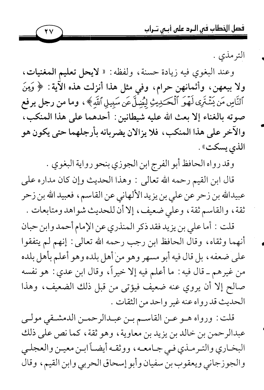 وعند البغوي فيه زيادة حسنة، ولفظه: «لا يحل تعليم المغنيات، ولا بيعهن، وأثمانهن حرام، وفي مثل هذا أنزلت هذه الآية: {وَمِنَ النَّاسِ مَن يَشْتَرِي لَهْوَ الْحَدِيثِ لِيُضِلَّ عَن سَبِيلِ اللَّهِ}، وما من رجل يرفع صوته بالغناء إلا بعث الله عليه شيطانين: أحدهما على هذا المنكب، والآخر على هذا المنكب، فلا يزالان يضربانه بأرجلهما حتى يكون هو الذي يسكت».