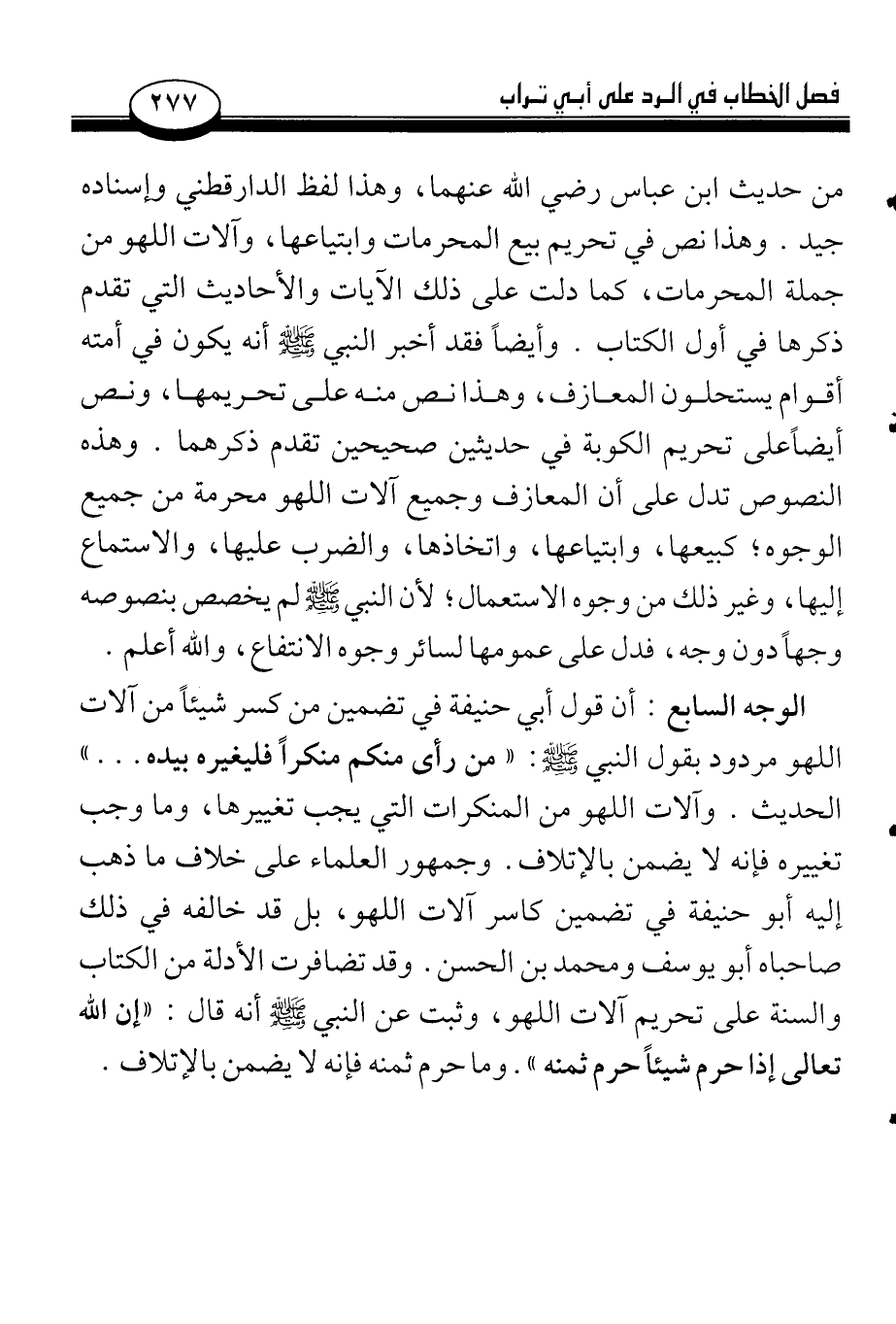 الوجه السابع: أن قول أبي حنيفة في تضمين من كسر شيئاً من آلات اللهو مردود بقول النبي صلى الله عليه وسلم: «من رأى منكم منكراً فليغيره بيده. . .» الحديث. آلات اللهو من المنكرات التي يجب تغييرها، وما وجب تغييره فإنه لا يضمن بالإتلاف. وجمهور العلماء على خلاف ما ذهب إليه أبو حنيفة في تضمين كاسر آلات اللهو، بل قد خالفه في ذلك صاحباه أبو يوسف ومحمد بن الحسن. وقد تضافرت الأدلة من الكتاب والسنة على تحريم آلات اللهو، وثبت عن النبي صلى الله عليه وسلم أنه قال: «إن الله تعالى إذا حرم شيئاً حرم ثمنه». وما حرم ثمنه فإنه لا يضمن بالإتلاف.