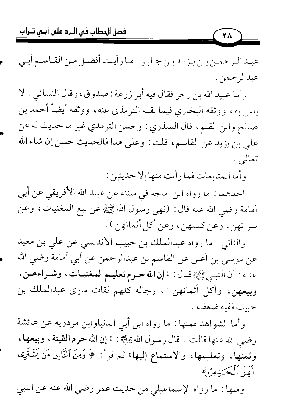 والثاني: ما رواه عبد الملك بن حبيب الأندلسي عن علي بن معبد عن موسى بن أعين عن القاسم بن عبد الرحمن عن أبي أمامة رضي الله عنه: أن النبي صلى الله عليه وسلم قال: «إن الله حرم تعليم المغنيات، وشراءهن، وبيعهن، وأكل أثمانهن»، رجاله كلهم ثقات سوى عبد الملك بن حبيب ففيه ضعيف.