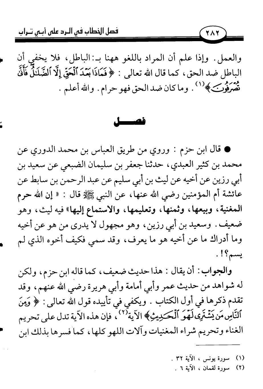 والجواب: أن يقال: هذا حديث ضعيف، كما قاله ابن حزم، ولكن له شواهد من حديث عمرو وأبي أمامة وأبي هريرة رضي الله عنهم، وقد تقدم ذكرها في أول الكتاب. ويكفي في تأييده قول الله تعالى: {وَمِنَ النَّاسِ مَن يَشْتَرِي لَهْوَ الْحَدِيثِ} الآية (¬2)، فإن هذه الآية تدل على تحريم الغناء وتحريم شراء المغنيات وآلات اللهو كلها، كما فسرها بذلك ابن