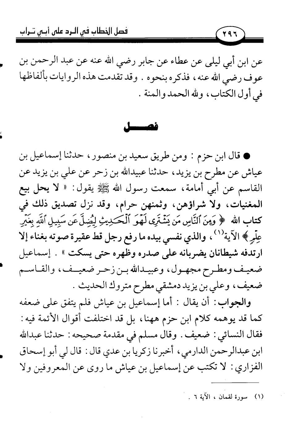 • قال ابن حزم: ومن طريق سعيد بن منصور، حدثنا إسماعيل بن عياش عن مطرح بن يزيد، حدثنا عبيد الله بن زحر عن علي بن يزيد عن القاسم عن أبي أمامة، سمعت رسول الله صلى الله عليه وسلم يقول: «لا يحل بيع المغنيات، ولا شراؤهن، وثمنهن حرام، وقد نزل تصديق ذلك في كتاب الله {وَمِنَ النَّاسِ مَن يَشْتَرِي لَهْوَ الْحَدِيثِ لِيُضِلَّ عَن سَبِيلِ اللَّهِ بِغَيْرِ عِلْمٍ} الآية (¬1)، والذي نفسي بيده ما رفع رجل قط عقيرة صوته بغناء إلا ارتدفه شيطانان يضربانه على صدره وظهره حتى يسكت». إسماعيل ضعيف ومطرح مجهول، وعبيد الله بن زحر ضعيف، والقاسم ضعيف، وعلي بن يزيد دمشقي مطرح متروك الحديث.