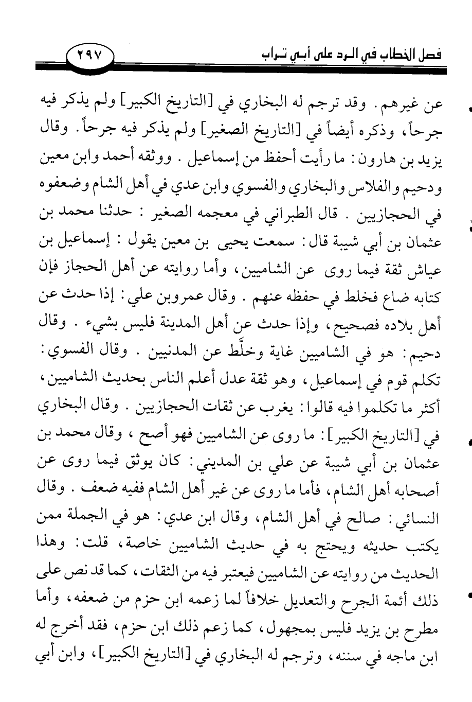 عن غيرهم. وقد ترجم له البخاري في [التاريخ الكبير] ولم يذكر فيه جرحاً، وذكره أيضاً في [التاريخ الصغير] ولم يذكر فيه جرحاً. وقال يزيد بن هارون: ما رأيت أحفظ من إسماعيل. ووثقه أحمد وابن معين ودحيم والفلاس والبخاري والفسوي وابن عدي في أهل الشام وضعفوه في الحجازيين. قال الطبراني في معجمه الصغير: حدثنا محمد بن عثمان بن أبي شيبة قال: سمعت يحيى بن معين يقول: إسماعيل بن عياش ثقة فيما روى عن الشاميين، وأما روايته عن أهل الحجاز فإن كتابه ضاع فخلط في حفظه عنهم. وقال عمرو بن علي: إذا حدث عن أهل بلاده فصحيح، وإذا حدث عن أهل المدينة فليس بشيء. وقال دحيم: هو في الشاميين غاية وخلَّط عن المدنيين. وقال الفسوي: تكلم قوم في إسماعيل، وهو ثقة عدل أعلم الناس بحديث الشاميين، أكثر ما تكلموا فيه قالوا: يغرب عن ثقات الحجازيين. وقال البخاري في [التاريخ الكبير]: ما روى عن الشاميين فهو أصح، وقال محمد بن عثمان بن أبي شيبة عن علي بن المديني: كان يوثق فيما روى عن أصحابه أهل الشام، فأما ما روى عن غير أهل الشام ففيه ضعف. وقال النسائي: صالح في أهل الشام، وقال ابن عدي: هو في الجملة ممن يكتب حديثه ويحتج به في حديث الشاميين خاصة، قلت: وهذا الحديث من روايته عن الشاميين فيعتبر فيه من الثقات، كما قد نص على ذلك أئمة الجرح والتعديل خلافاً لما زعمه ابن حزم من ضعفه، وأما مطرح بن يزيد فليس بمجهول، كما زعم ذلك ابن حزم، من ضعفه، وأما مطرح بن يزيد فليس بمجهول، كما زعم ذلك ابن حزم، فقد أخرج له ابن ماجه في سننه، وترجم له البخاري في [التاريخ الكبير]، وابن أبي