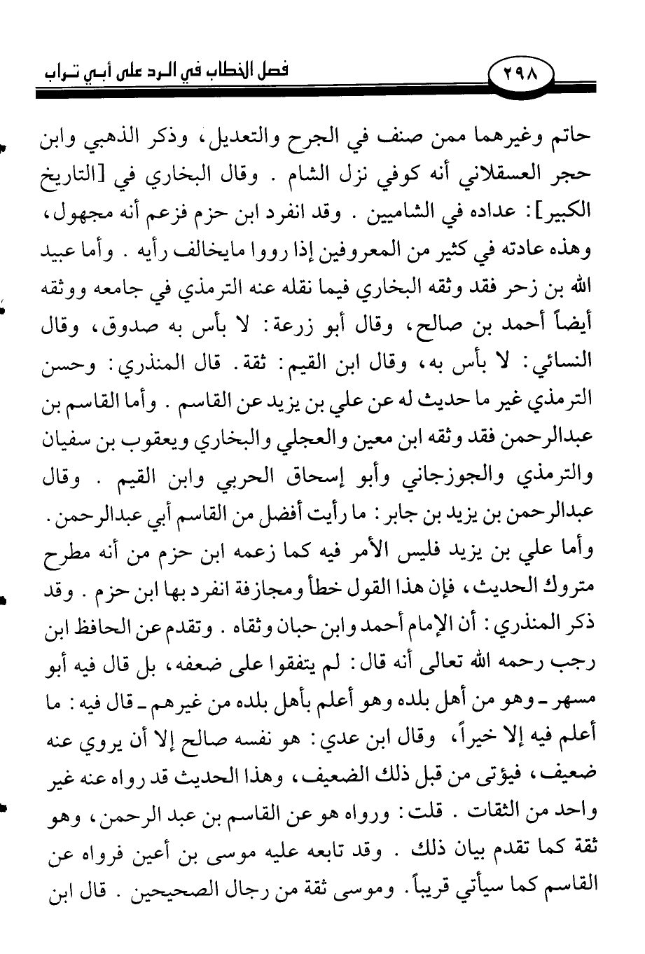 حاتم وغيرهما ممن صنف في الجرح والتعديل، وذكر الذهبي وابن حجر العسقلاني أنه كوفي نزل الشام. وقال البخاري في [التاريخ الكبير]: عداده في الشاميين. وقد انفرد ابن حزم فزعم أنه مجهول، وهذه عادته في كثير من المعروفين إذا رووا ما يخالف رأيه. وأما عبيد الله بن زحر فقد وثقه البخاري فيما نقله عنه الترمذي في جامعه ووثقه أيضاً أحمد بن صالح، وقال ابو زرعة: لا بأس به صدوق، وقال النسائي: لا بأس به، وقال ابن القيم: ثقة. قال المنذري: وحسن الترمذي غير ما حديث له عن علي بن يزيد عن القاسم. وأما القسم بن عبد الرحمن فقد وثقه ابن معين والعجلي والبخاري ويعقوب بن سفيان والترمذي والجوزجاني وأبو إسحاق الحربي وابن القيم. وقال عبد الرحمن بن يزيد بن جابر: ما رأيت أفضل من القاسم أبي عبد الرحمن. وأما علي بن يزيد فليس الأمر فيه كما زعمه ابن حزم من أنه مطرح متروك الحديث، فإن هذا القول خطأ ومجازفة انفرد بها ابن حزم. وقد ذكر المنذري: أن الإمام أحمد وابن حبان وثقاه. وتقدم عن الحافظ بن رجب رحمه الله تعالى أنه قال: لم يتفقوا على ضعفه، بل قال فيه أبو مسهر - وهو من أهل بلده وهو أعلم بأهل بلده من غيرهم - قال فيه: ما أعلم فيه إلا خيراً، وقال ابن عدي: هو نفسه صالح إلا أن يروى عنه ضعيف، فيؤتى من قبل ذلك الضعيف، وهذا الحديث قد رواه عنه غير واحد من الثقات. قلت: ورواه هو عن القاسم بن عبد الرحمن، وهو ثقة كما تقدم بيان ذلك. وقد تابعه عليه موسى بن أعين فرواه عن القاسم كما سيأتي قريباً. وموسى ثقة من رجال الصحيحين. قال ابن