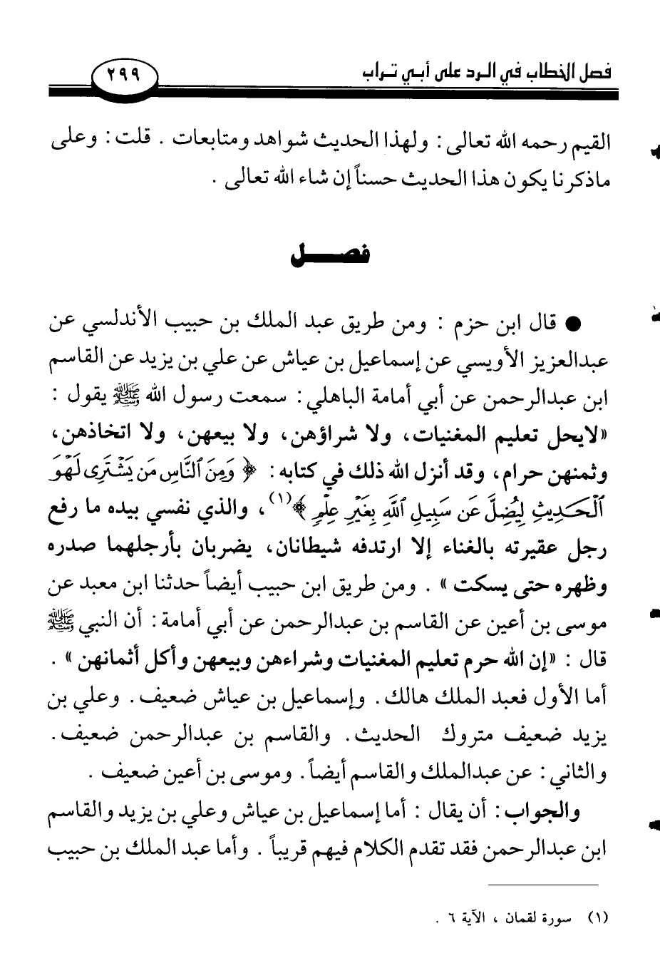 • قال ابن حزم: ومن طريق عبد الملك بن حبيب الأندلسي عن عبد العزيز الأويسي عن إسماعيل بن عياش عن علي بن يزيد عن القاسم ابن عبد الرحمن عن أبي أمامة الباهلي: سمعت رسول الله صلى الله عليه وسلم يقول: «لا يحل تعليم المغنيات، ولا شرؤاهن، ولا بيعهن، ولا اتخاذهن، وثمنهن حرام، وقد أنزل الله ذلك في كتابه: {وَمِنَ النَّاسِ مَن يَشْتَرِي لَهْوَ الْحَدِيثِ لِيُضِلَّ عَن سَبِيلِ اللَّهِ بِغَيْرِ عِلْمٍ} (¬1)، والذي نفسي بيده ما رفع رجل عقيرته بالغناء إلا ارتدفه شيطانان، يضربان بأرجلهما صدره وظهره حتى يسكت». ومن طريق ابن حبيب أيضاً حدثنا ابن معبد عن موسى بن أعين عن القاسم بن عبد الرحمن عن أبي أمامة: أن النبي صلى الله عليه وسلم قال: «إن الله حرم تعليم المغنيات وشراءهن وبيعهن وأكل أثمانهن». أما الأول فعبد الملك هالك. وإسماعيل بن عياش ضعيف. وعلي بن يزيد ضعيف متروك الحديث. والقاسم بن عبد الرحمن ضعيف. والثاني: عن عبد الملك والقاسم أيضاً. وموسى بن أعين ضعيف.