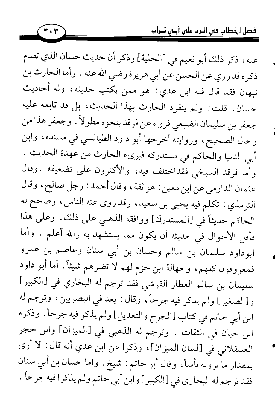 عنه، ذكر ذلك أبو نعيم في [الحلية] وذكر أن حديث حسان الذي تقدم ذكره قد روي عن الحسن عن أبي هريرة رضي الله عنه. وأما الحارث بن نبهان فقد قال فيه ابن عدي: هو ممن يكتب حديثه، وله أحاديث حسان. قلت: ولم ينفرد الحارث بهذا الحديث، بل قد تابعه عليه جعفر بن سليمان الضبعي فرواه عن فرقد بنحوه مطولاً. وجعفر هذا من رجال الصحيح، وروايته أخرجها أبو داود الطيالسي في مسنده، وابن أبي الدنيا والحاكم في مستدركه فبرئ الحارث من عهدة الحديث. وأما فرقد السبخي فقد اختلف فيه، والأكثرون على تضعيفه. وقال عثمان الدارمي عن ابن معين: هو ثقة، وقال أحمد: رجل صالح، وقال الترمذي: تكلم فيه يحيى بن سعيد، وقد روى عنه الناس، وصحح له الحاكم حديثاً في [المستدرك] ووافقه الذهبي على ذلك، وعلى هذا فأقل الأحوال في حديثه أن يكون مما يستشهد به والله أعلم. وأما أبو داود سليمان بن سالم وحسان بن أبي سنان وعاصم بن عمرو فمعروفون كلهم، وجهالة ابن حزم لهم لا تضرهم شيئاً. أما أبو داود سليمان بن سالم العطار القرشي فقد ترجم له البخاري في [الكبير] و [الصغير] ولم يذكر فيه جرحاً، وقال: يعد في البصريين، وترجم له ابن أبي حاتم في كتاب [الجرح والتعديل] ولم يذكر فيه حرجاً. وذكره ابن حبان في الثقات. وترجم له الذهبي في [الميزان] وابن حجر العسقلاني في [لسان المزمار]، وذكرا عن ابن عدي أنه قال: لا أرى بمقدار ما يرويه بأساً، وقال أبو حاتم: شيخ. وأما حسان بن أبي سنان فقد ترجم له البخاري في [الكبير] وابن أبي حاتم ولم يذكرا فيه جرحاً.