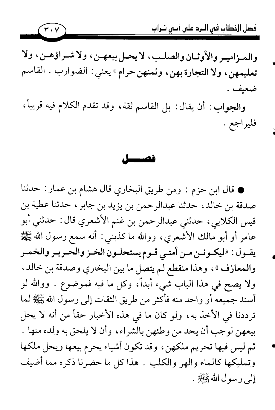 • قال ابن حزم: ومن طريق البخاري قال هشام بن عمار: حدثنا صدقة بن خالد، حدثنا عبد الرحمن بن يزيد بن جابر، حدثنا عطية بن قيس الكلابي، حدثني عبد الرحمن بن غنم الأشعري قال: حدثني أبو عامر أو أبو مالك الأشعري، ووالله ما كذبني: أنه سمع رسول الله صلى الله عليه وسلم يقول: «ليكونن من أمتي قوم يستحلون الخز والحرير والخمر والمعازف»، وهذا منقطع لم يتصل ما بين البخاري وصدقة بن خالد، ولا يصح في هذا الباب شيء أبداً، وكل ما فيه فموضوع. ووالله لو أسند جميعه أو واحد منه فأكثر من طريق الثقات إلى رسول الله صلى الله عليه وسلم لما ترددنا في الأخذ به، ولو كان ما في هذه الأخبار حقاً من أنه لا يحل بيعهن لوجب أن يحد من وطئهن بالشراء، وأن لا يلحق به ولده منها. ثم ليس فيها تحريم ملكهن، وقد تكون أشياء يحرم بيعها ويحل ملكها وتمليكها كالماء والهر والكلب. هذا كل ما حضرنا ذكره مما أضيف إلى رسول الله صلى الله عليه وسلم.