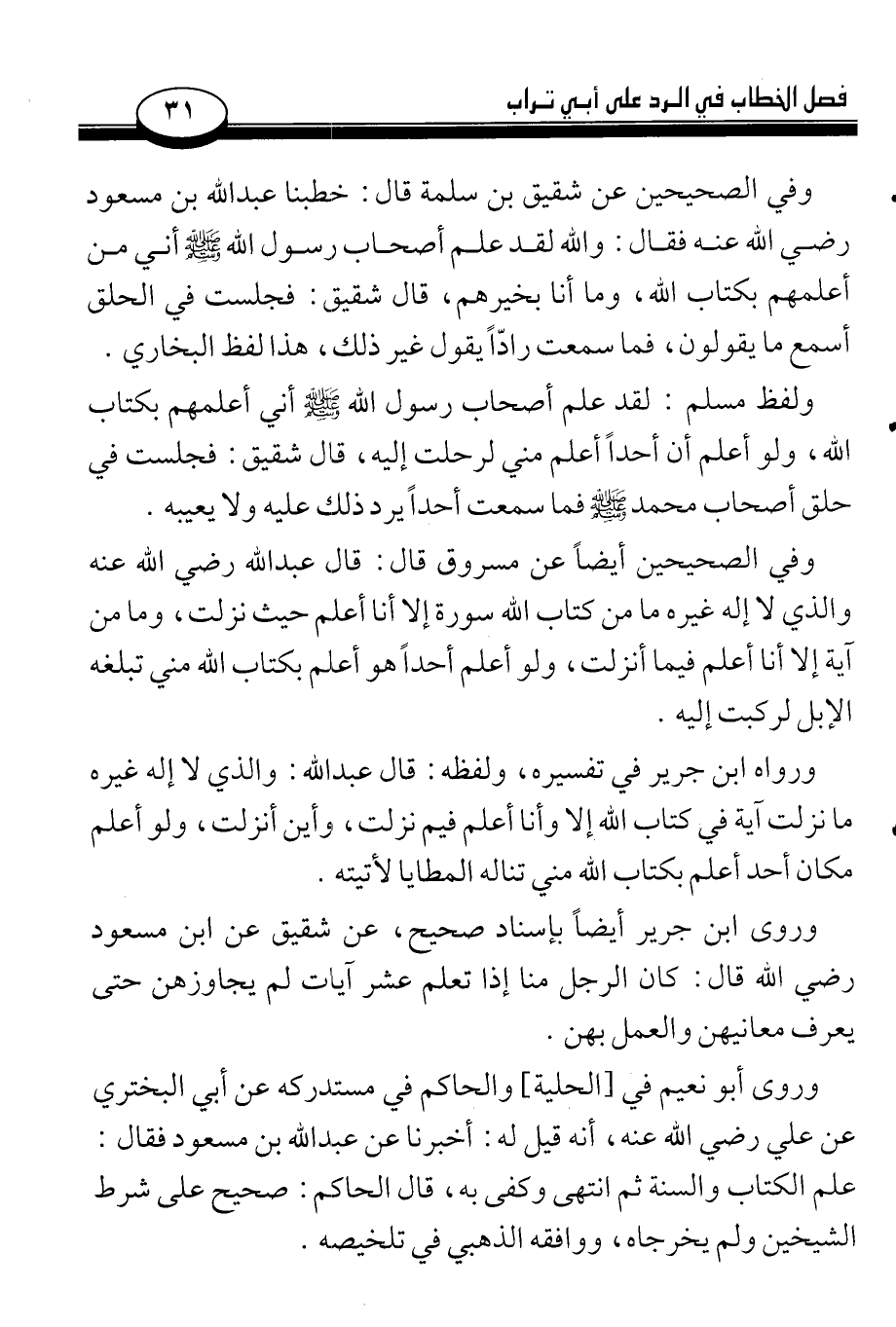 ولفظ مسلم: لقد علم أصحاب رسول الله صلى الله عليه وسلم أني أعلمهم بكتاب الله، ولو أعلم أن أحداً أعلم مني لرحلت إليه، قال شقيق: فجلست في حلق أصحاب محمد صلى الله عليه وسلم فما سمعت أحداً يرد ذلك عليه ولا يعيبه.